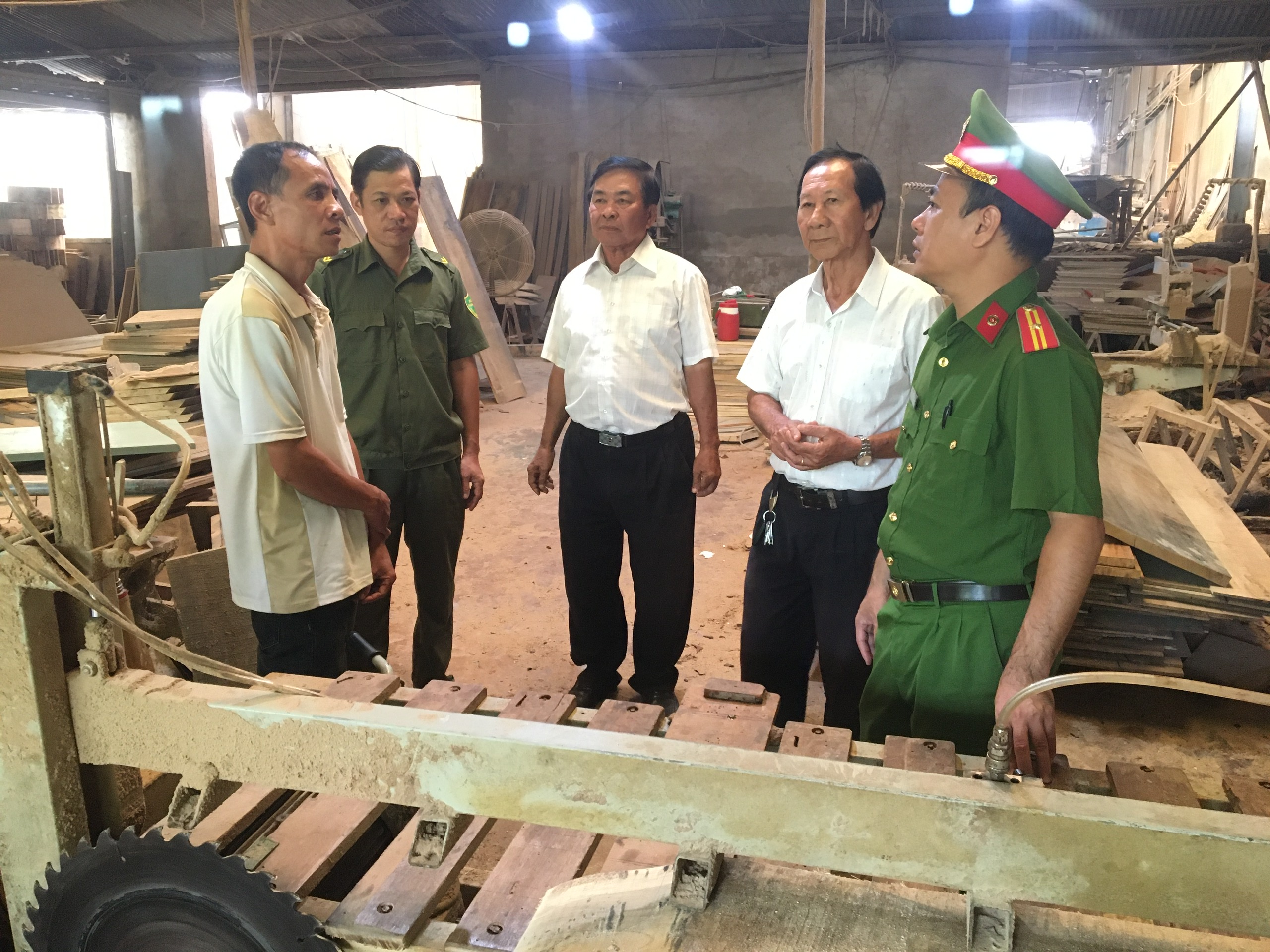 Cảnh sát khu vực, khu phố, lực lượng ANTT cơ sở và hàng xóm tham quan cơ sở mộc của anh Trần Văn Bình (bìa trái)