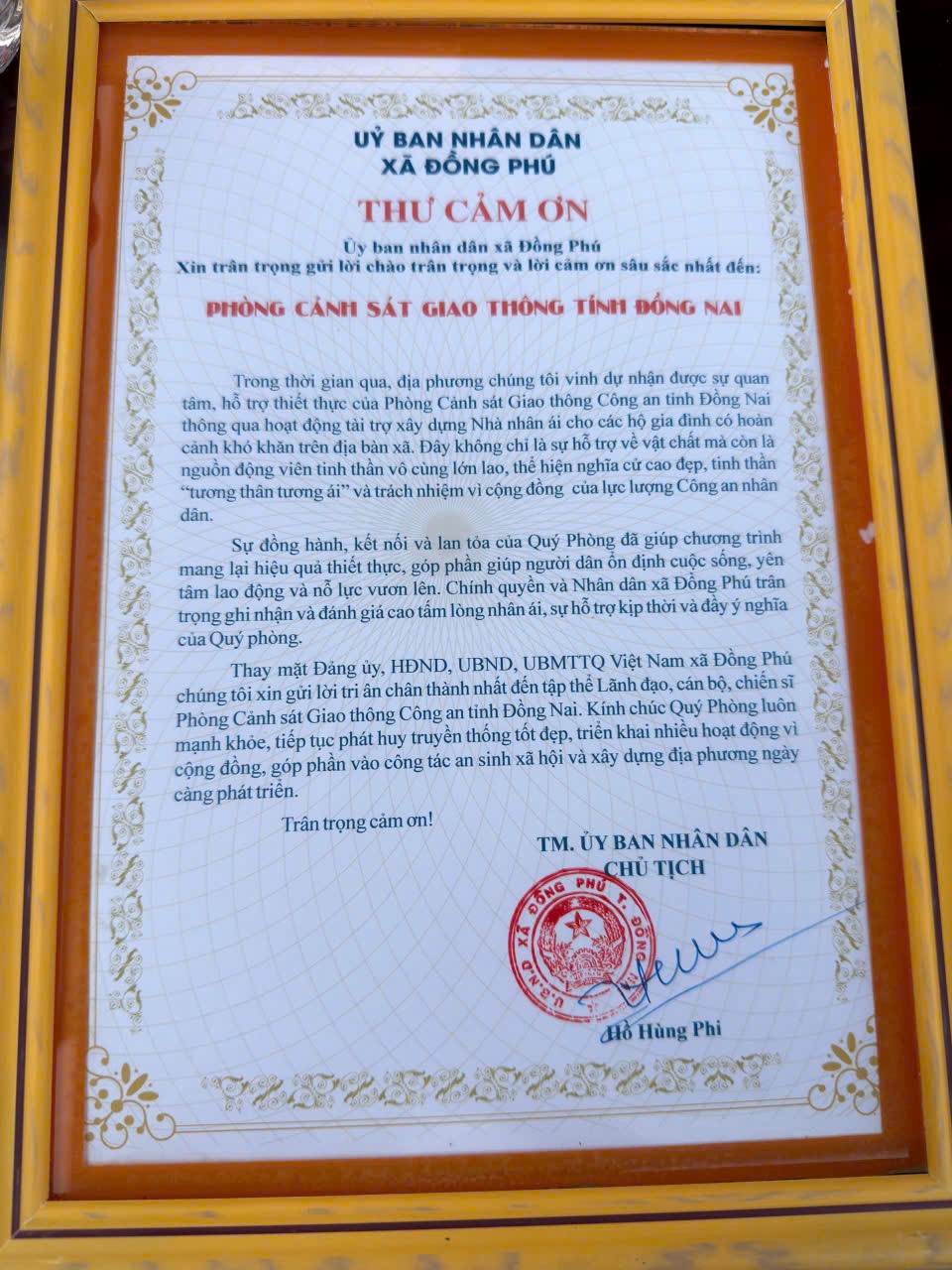 Ghi nhận sự đóng góp của lực lượng Công an, UBND xã Đồng Phú đã trao Thư cảm ơn gửi đến Phòng CSGT Công an tỉnh Đồng Nai. Thư nêu rõ: Sự đồng hành, kết nối của Phòng CSGT đã giúp chương trình mang lại hiệu quả thiết thực, góp phần giúp người dân ổn định cuộc sống, yên tâm lao động và nỗ lực vươn lên. Chính quyền và Nhân dân xã Đồng Phú trân trọng ghi nhận và đánh giá cao tấm lòng nhân ái, sự hỗ trợ kịp thời và đầy ý nghĩa của đơn vị; không chỉ giúp hộ nghèo có nơi ở ổn định mà còn lan tỏa tinh thần “tương thân tương ái”, khẳng định vai trò của lực lượng Công an trong công tác an sinh xã hội tại địa phương.