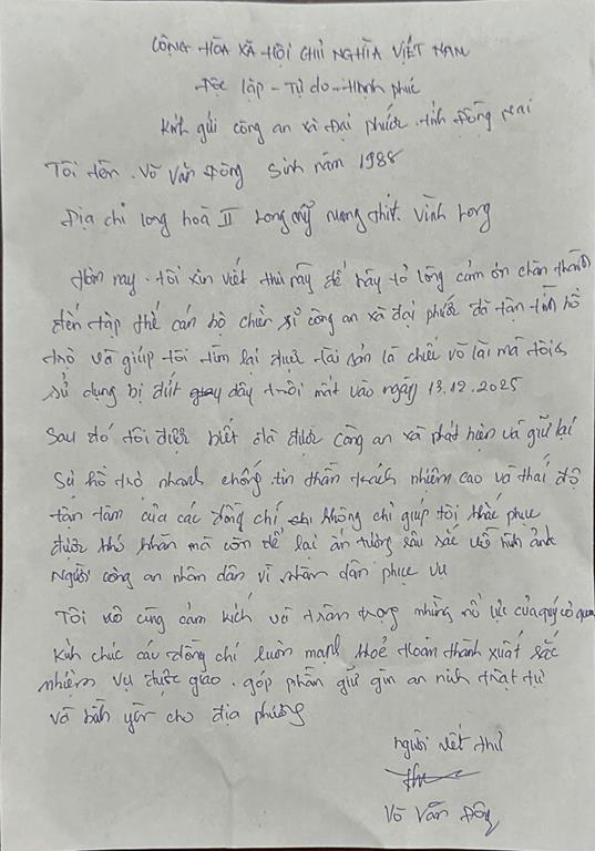 Thư cảm ơn Công an xã Đại Phước của anh Võ Văn Đông