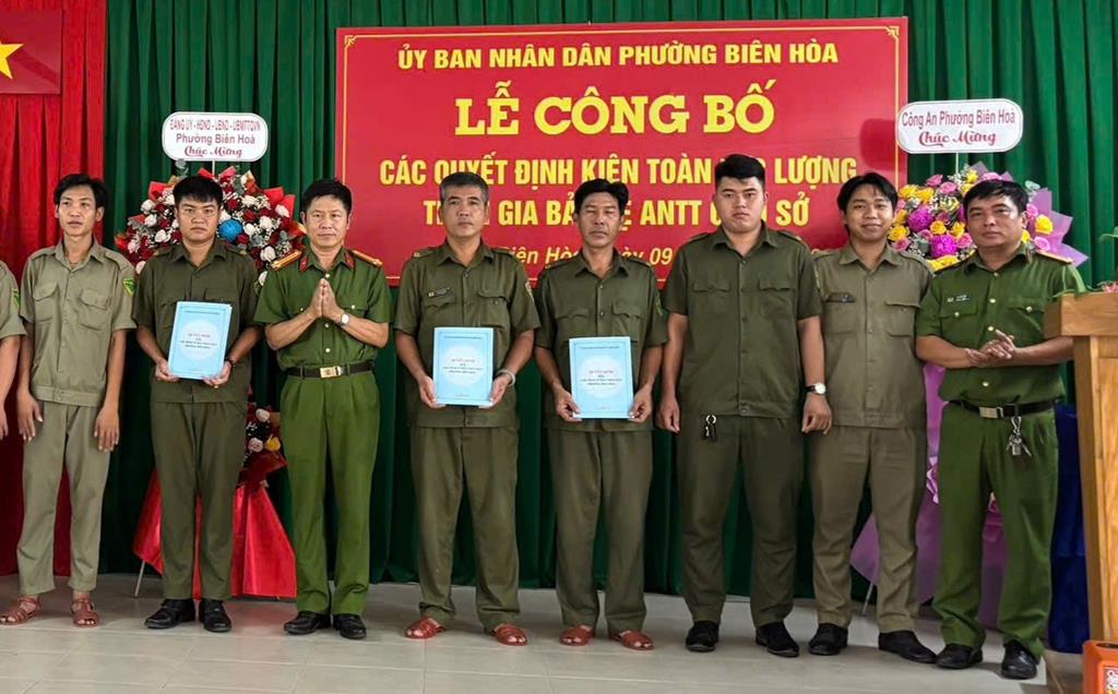 Anh Nguyễn Hoàng Phước, đứng thứ hai từ trái sang trong buổi Lễ công bố các quyết định kiện toàn Lực lượng bảo vệ ANTT ở cơ sở.