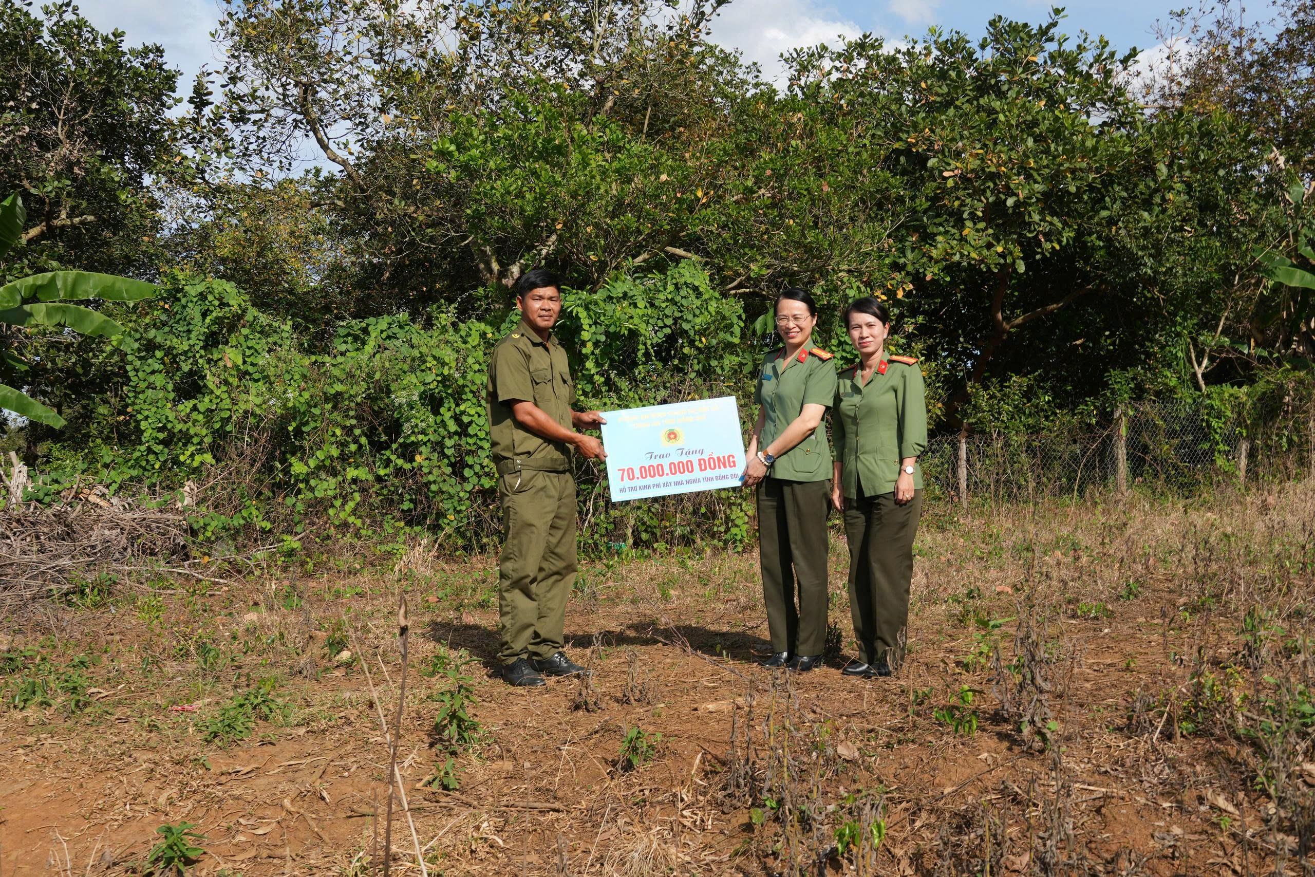 Đồng chí Thượng tá Phạm Hồng Chính, Trưởng phòng An ninh Chính trị nội bộ thay mặt đoàn công tác đã thăm hỏi, chia sẻ, động viên, tặng quà cho gia đình đồng chí Nguyễn Thành Long; đồng thời trao đổi nắm tình hình, khảo sát vị trí khu vực chuẩn bị khởi công xây nhà “Nghĩa tình đồng đội” cho đồng chí. Tại đây, đồng Trưởng phòng An ninh Chính trị nội bộ đã trao bảng tượng trưng, hỗ trợ kinh phí 70 triệu đồng cho đồng chí Long để xây nhà “Nghĩa tình đồng đội”.
