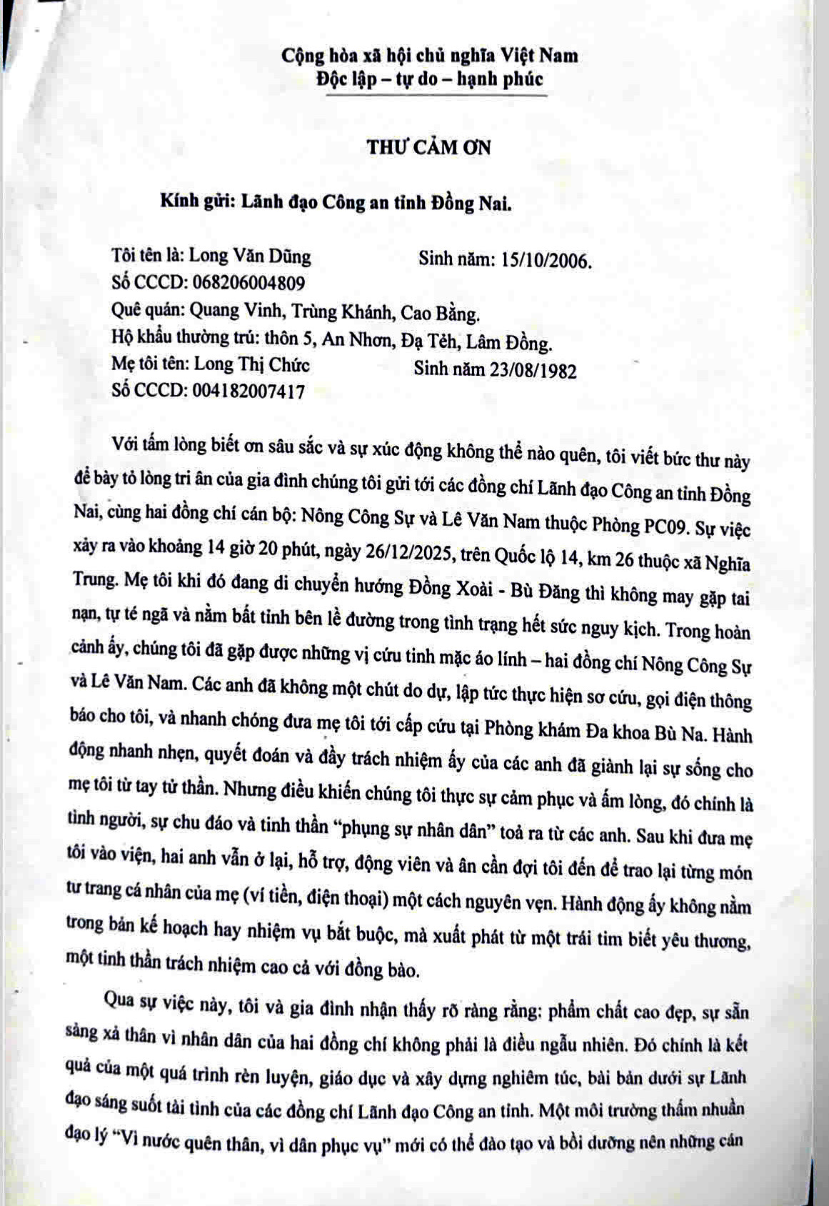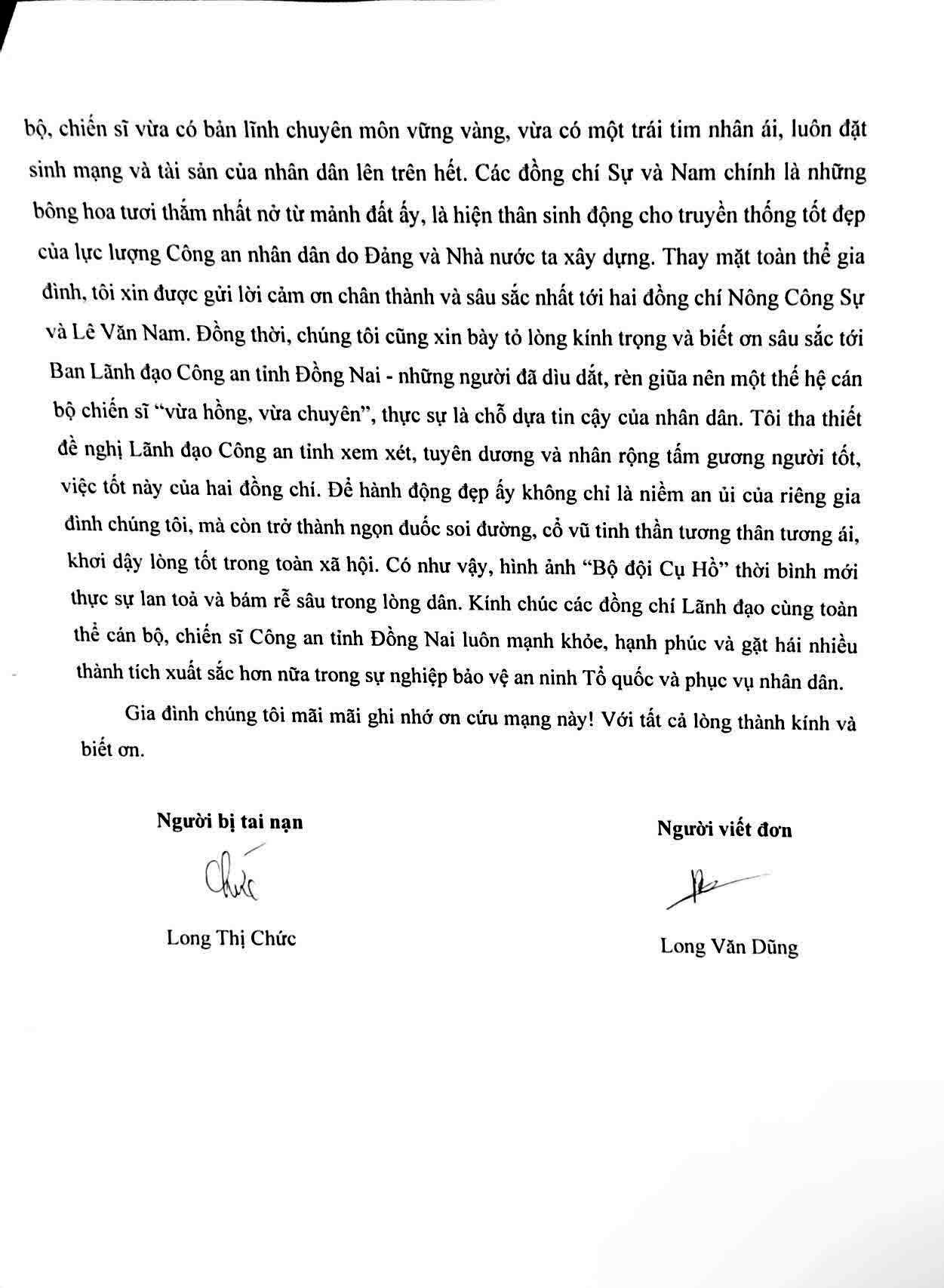 Kết thúc là thư, anh Dũng viết: Thay mặt toàn thể gia đình, tôi xin được gửi lời cảm ơn chân thành và sâu sắc tới các đồng chí Sự và Nam, chúng tôi xin bày tỏ lòng kính trọng và biết ơn tới Lãnh đạo Công an tỉnh Đồng Nai. Tôi tha thiết đề nghị Lãnh đạo Công an tỉnh Đồng Nai xem xét, tuyên dương và nhân rộng tấm gương “người tốt, việc tốt” của hai đồng chí, để hành động đẹp ấy cổ vũ tinh thần tương thân, tương ái, khơi dậy những hành động đẹp trong toàn xã hội. Gia đình chúng tôi mãi ghi nhớ ơn cứu mạng này với tất cả lòng thành kính và biết ơn.