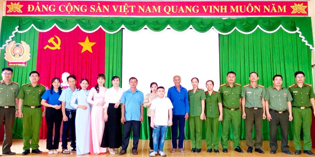 Các đại biểu và Ban Công an xã Minh Đức chụp ảnh lưu niệm với con nuôi Hà Đình Huy và đại diện gia đình trong buổi Lễ ra mắt mô hình “Con nuôi Công an xã”.