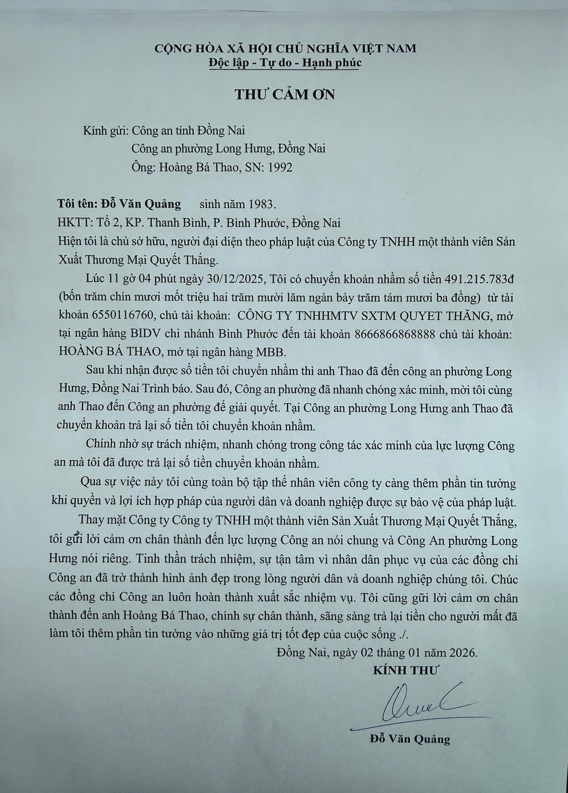 Trước tinh thần trách nhiệm, sự hỗ trợ kịp thời, hiệu quả của lực lượng Công an, Công ty Quyết Thắng đã có thư cảm ơn gửi Ban Giám đốc Công an tỉnh Đồng Nai, cùng tập thể lãnh đạo, cán bộ, chiến sĩ Công an phường Long Hưng, bày tỏ sự trân trọng và niềm tin đối với lực lượng Công an nhân dân.