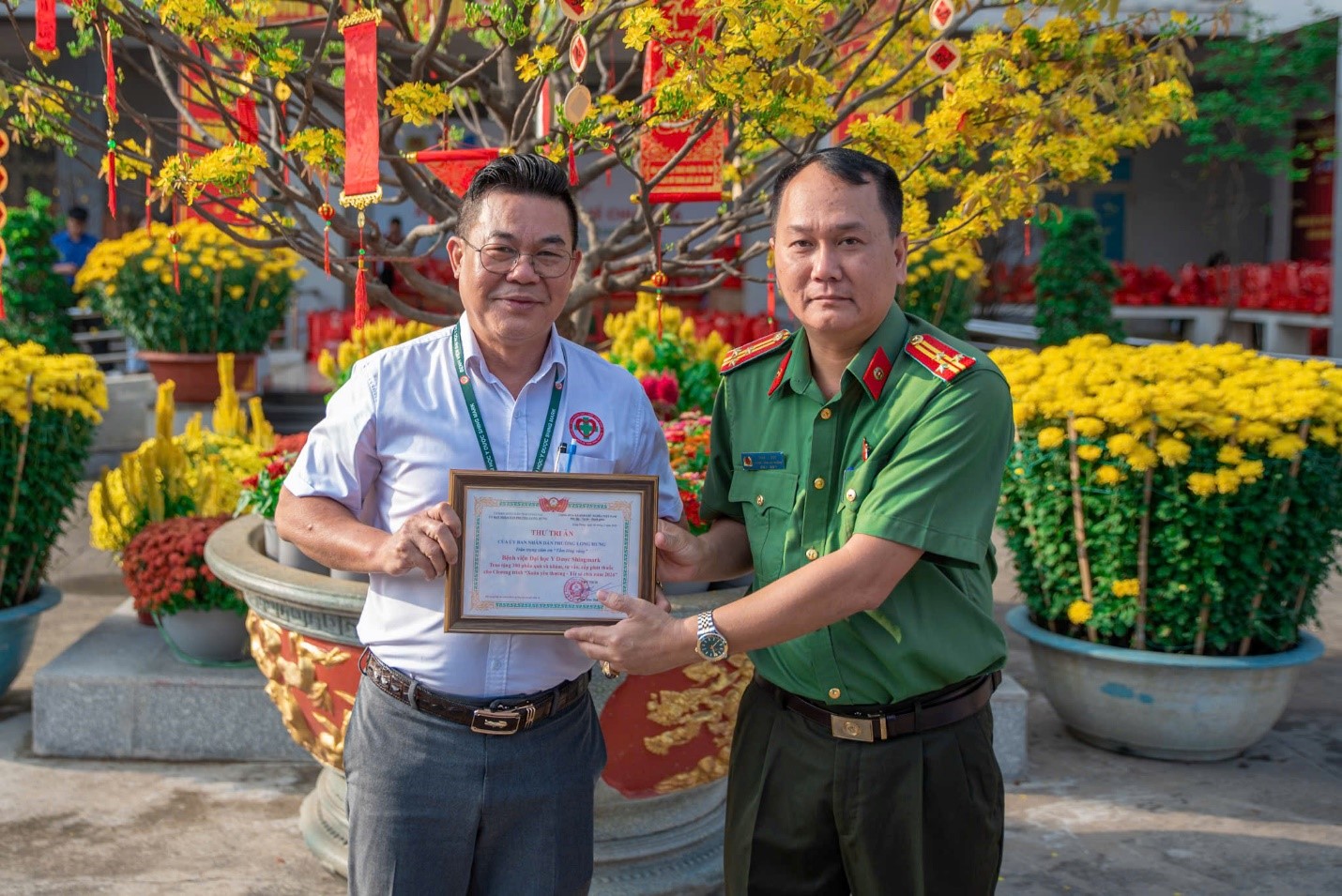 Đồng chí Trưởng Công an phường tặng bảng tri ân đơn vị phối hợp
