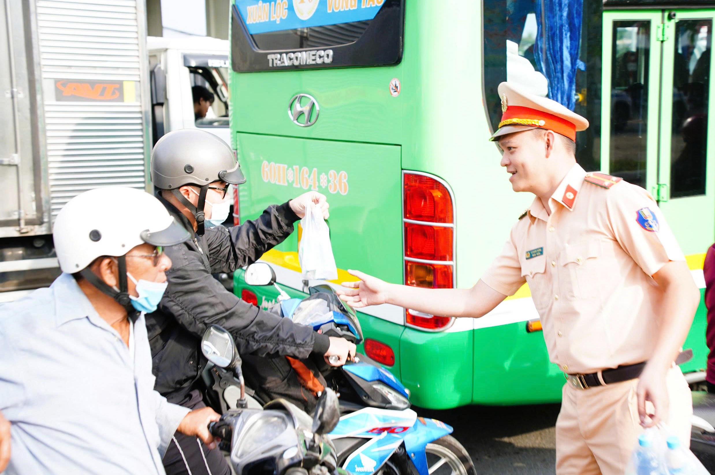 Ghi nhận trong sáng 13/02 (tức ngày 26 Tết) - ngày đầu kỳ nghỉ Tết, tại khu vực cầu Đồng Nai, ngã tư Amata (TP.Biên Hòa cũ) và nhiều tuyến quốc lộ, lượng phương tiện tăng cao, đặc biệt là người dân di chuyển bằng xe máy, ô tô cá nhân về các tỉnh miền Trung và Tây Nguyên. Việc được lực lượng CSGT trao tận tay chai nước mát, chiếc khăn lạnh giữa hành trình dài đã mang lại cảm giác gần gũi, ấm áp cho nhiều người tham gia giao thông.