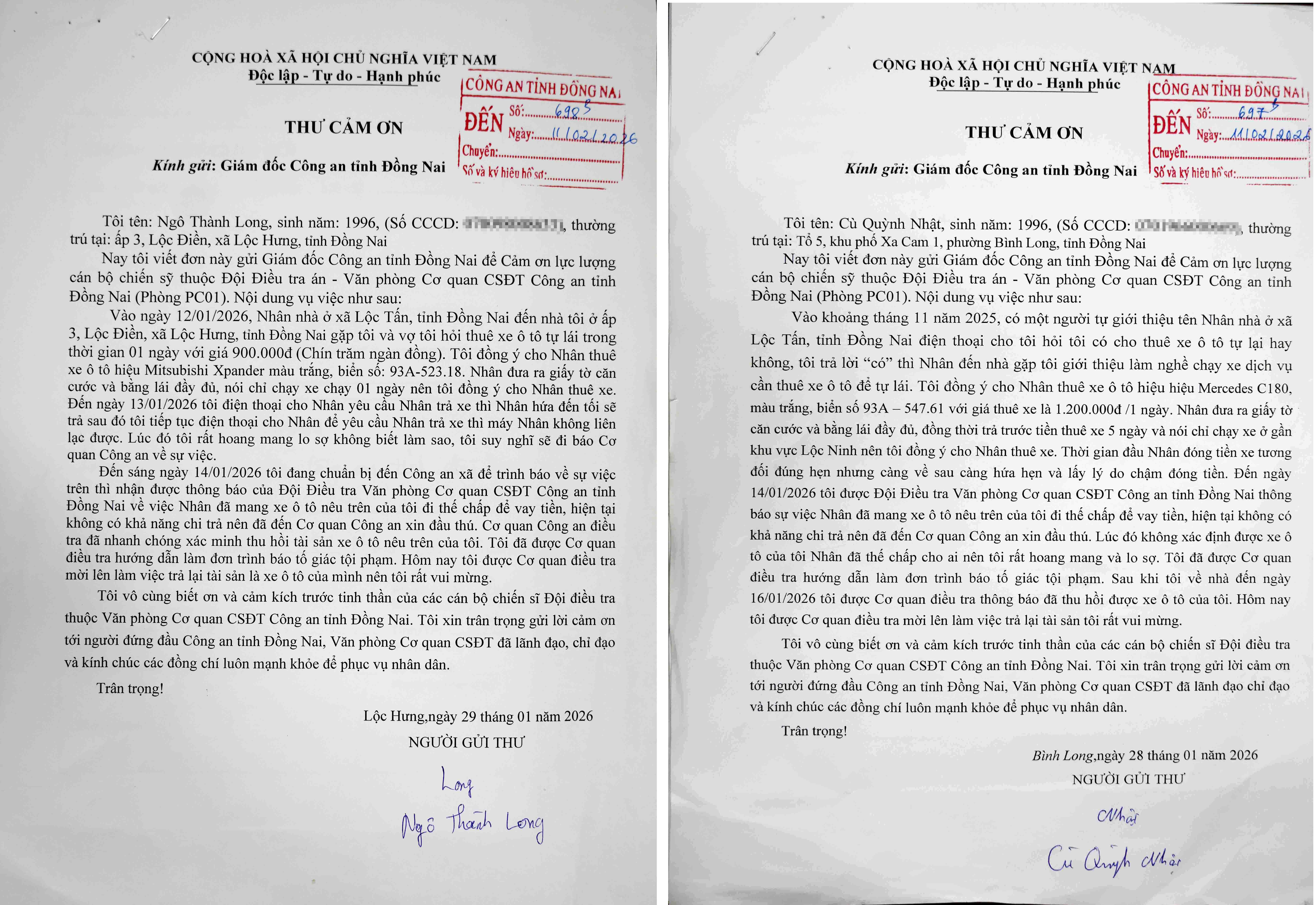 Trong lá thư của anh Cù Quỳnh Nhật, viết: Vào khoảng tháng 11/2025, một người tên Nhân nhà ở xã Lộc Tấn, tỉnh Đồng Nai điện thoại cho tôi hỏi thuê xe tự lái. Sau đó, Nhân đến nhà tôi và tự giới thiệu làm nghề chạy xe dịch vụ, cần thuê xe ô tô tự lái. Tôi đồng ý cho Nhân thuê chiếc xe ô tô hiệu Mercedes C180 - BKS 93A-547.61 với giá thuê xe 1.200.000đ/ngày. Nhân đưa ra đầy đủ Căn cước và Giấy phép lái xe, đồng thời trả trước tiền thuê xe 5 ngày. Nhân cho biết thêm, chỉ chạy xe ở gần khu vực Lộc Ninh nên tôi đồng ý cho Nhân thuê xe. Thời gian đầu, Nhân đóng tiền xe tương đối đúng hẹn, nhưng càng về sau thì đóng tiền chậm và đưa ra nhiều lý do khác nhau. Đến ngày 14/01/2026, tôi nhận được thông báo từ Văn phòng Cơ quan Cảnh sát điều tra Công an tỉnh Đồng Nai cho biết Nhân đã mang chiếc xe thuê của tôi đi thế chấp để vay tiền, hiện tại Nhân không có khả năng chi trả nên đã đến cơ quan Công an xin đầu thú. Khi biết thông tin đó, tôi không biết Nhân đã thế chấp chiếc xe ô tô của tôi cho ai, ở đâu nên tôi đã rất hoang mang và lo sợ. Cơ quan điều tra đã hướng dẫn tôi làm đơn trình báo tố giác tội phạm. Đến ngày 16/01/2026, tôi được Văn phòng Cơ quan Cảnh sát điều tra thông báo cho biết đã thu hồi được chiếc xe ô tô của tôi. Sau đó tôi được mời lên Văn phòng Cơ quan Cảnh sát điều tra nhận lại chiếc xe ô tô.