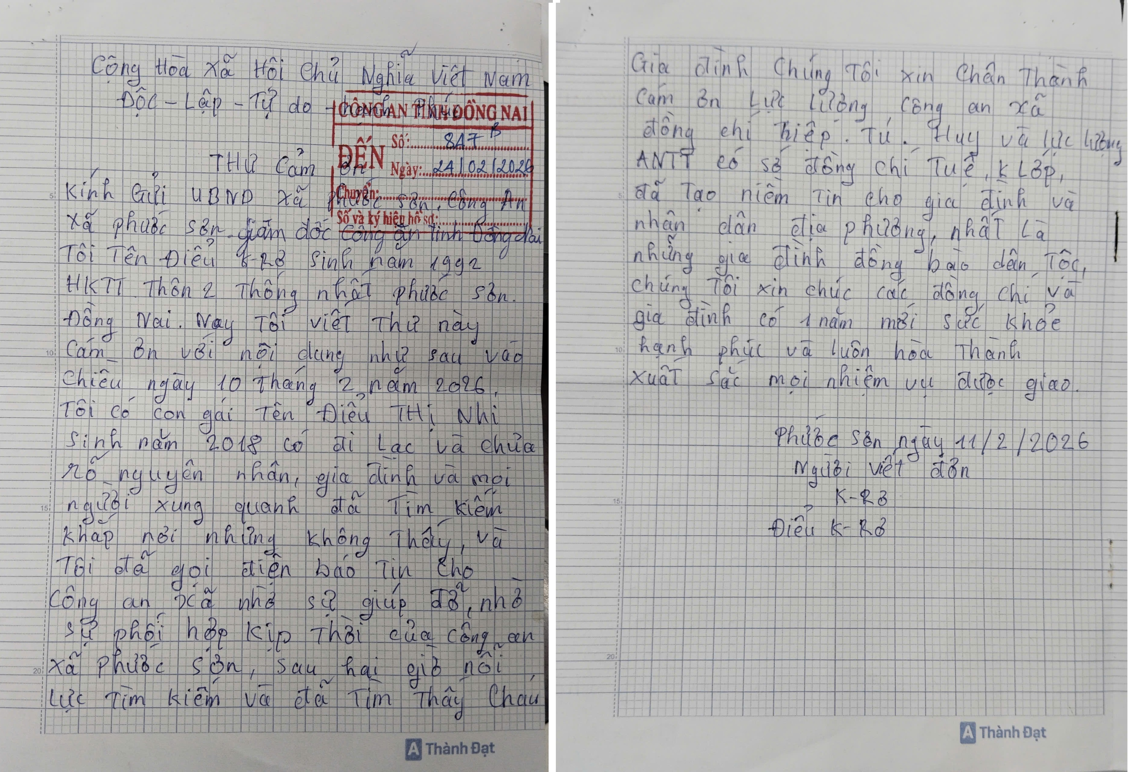Lá thư thứ hai là của anh Điểu Krơ (SN1992), trú xã Phước Sơn, tỉnh Đồng Nai gửi tới Công an xã Phước Sơn và Công an tỉnh Đồng Nai, trong thư anh Điểu Krơ viết: Ngày 10/2/2026, con gái tôi là Điểu Thị Nhi (SN 2018) đi chơi bị lạc không biết đường về nhà, gia đình và mọi người xung quanh tổ chức đi tìm cháu khắp nơi nhưng không thấy. Không tìm được con nên tôi đã gọi điện thoại trình báo đến Công an xã Phước Sơn để nhờ giúp đỡ. Với tinh thần trách nhiệm cao, tận tình giúp đỡ nên chỉ sau 2 giờ nỗ lực tìm kiếm, Công an xã và lực lượng ANTT ở cơ sở đã tìm thấy cháu.