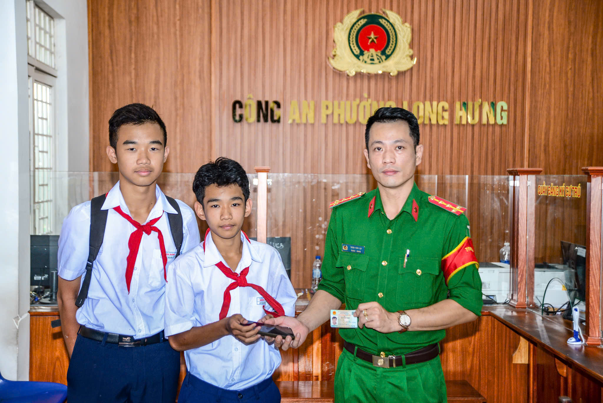 Trưa ngày 17/3/2026, trên đường đi học về, hai em Nguyễn Gia Bảo và Nguyễn Thái Sơn, học sinh Trường THCS Hòa Hưng, phường Long Hưng đã nhặt được một chiếc điện thoại di động và giấy tờ tùy thân mang tên Tô Văn Hiếu.