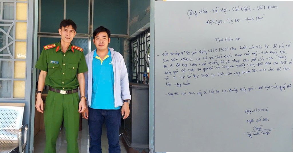 Ngày 18/3, Công an phường Hàng Gòn, tỉnh Đồng Nai cho biết, đơn vị vừa nhận được thư cảm ơn của anh Nguyễn Nhật Quyền (ngụ xã Xuân Đường) về việc lực lượng Công an phường đã kịp thời hỗ trợ, đưa bố ruột của anh đi cấp cứu trong tình huống nguy kịch.