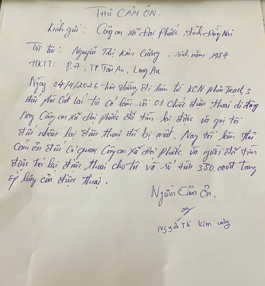 Tại buổi bàn giao, chị Cương xúc động khi nhận lại đầy đủ tài sản đã bị đánh rơi, bao gồm 01 điện thoại di động và số tiền 330 ngàn đồng để trong ốp lưng điện thoại. Chị đã gửi thư cảm ơn, bày tỏ sự trân trọng đối với tinh thần trách nhiệm, tận tụy của lực lượng Công an xã Đại Phước cũng như nghĩa cử cao đẹp của người dân nhặt được tài sản.
