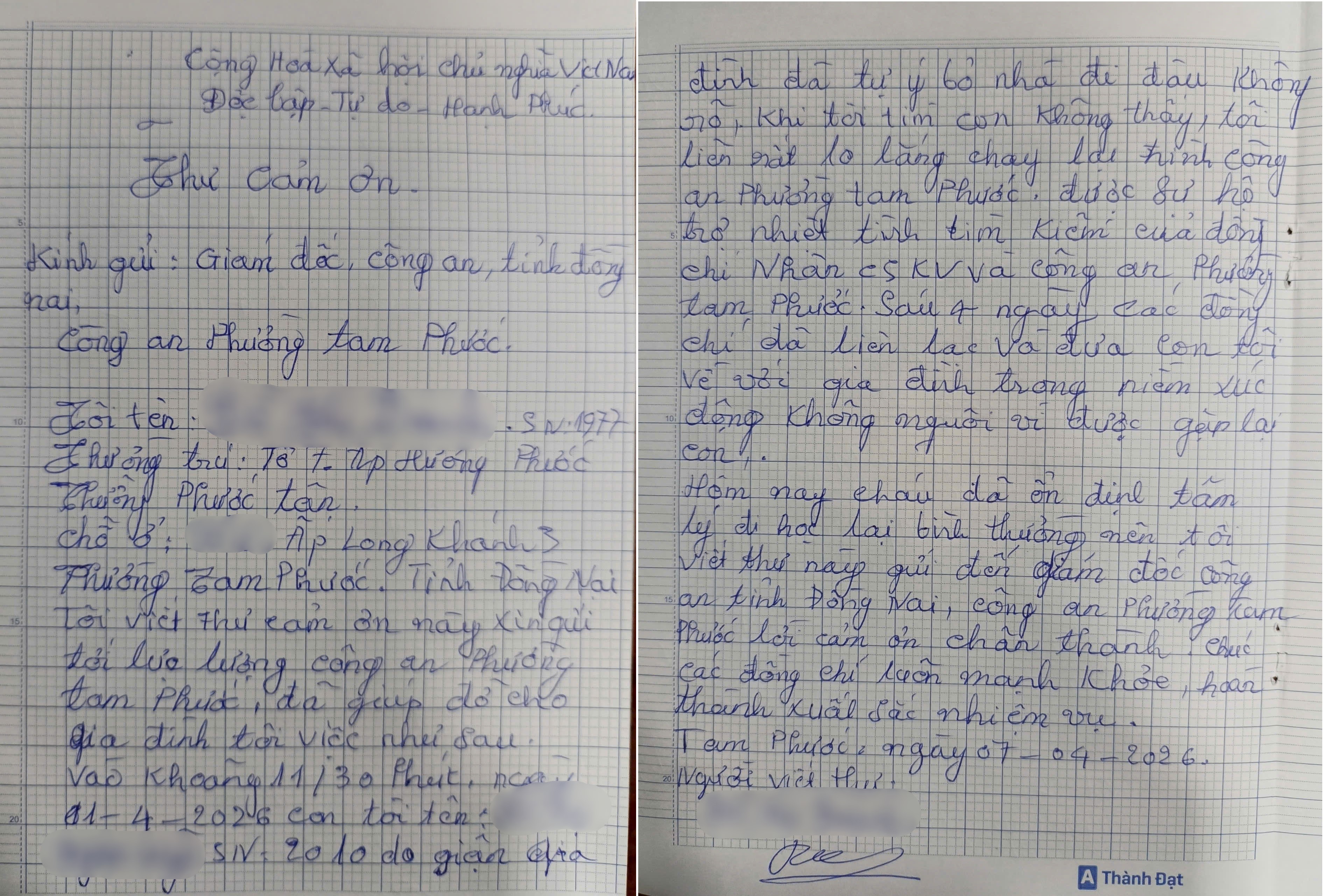 Ngày 07/4/2026, Công an phường Tam Phước đã nhận được thư cảm ơn của chị Đ. Th.D (sinh năm 1977, ngụ khu phố Long Khánh 3, phường Tam Phước) về việc lực lượng Công an đã hỗ trợ tìm kiếm con gái của mình là Ng.M (sinh năm 2010) sau khi cháu bỏ nhà đi.