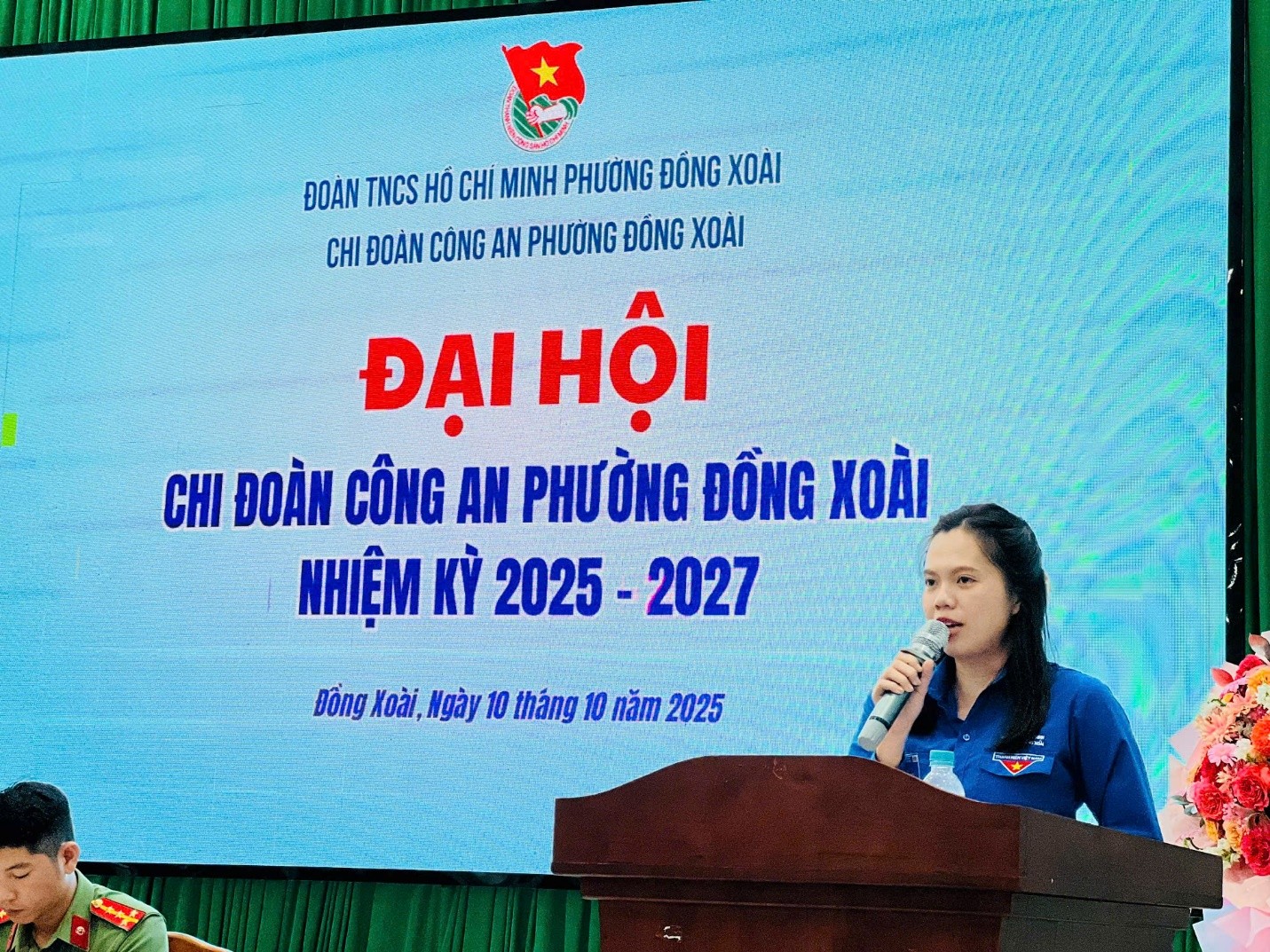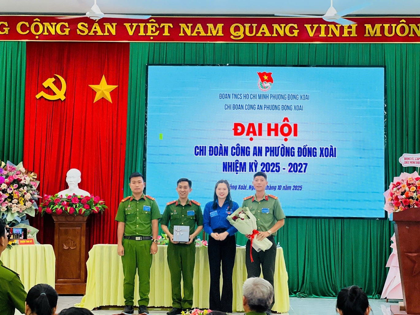 Đ/c Phạm Nguyễn Minh Trinh – Bí thư Đoàn phường tặng hoa và quà chúc mừng chúc mừng Đại hội Chi đoàn Công an phường lần thứ nhất, nhiệm kỳ 2025-2027