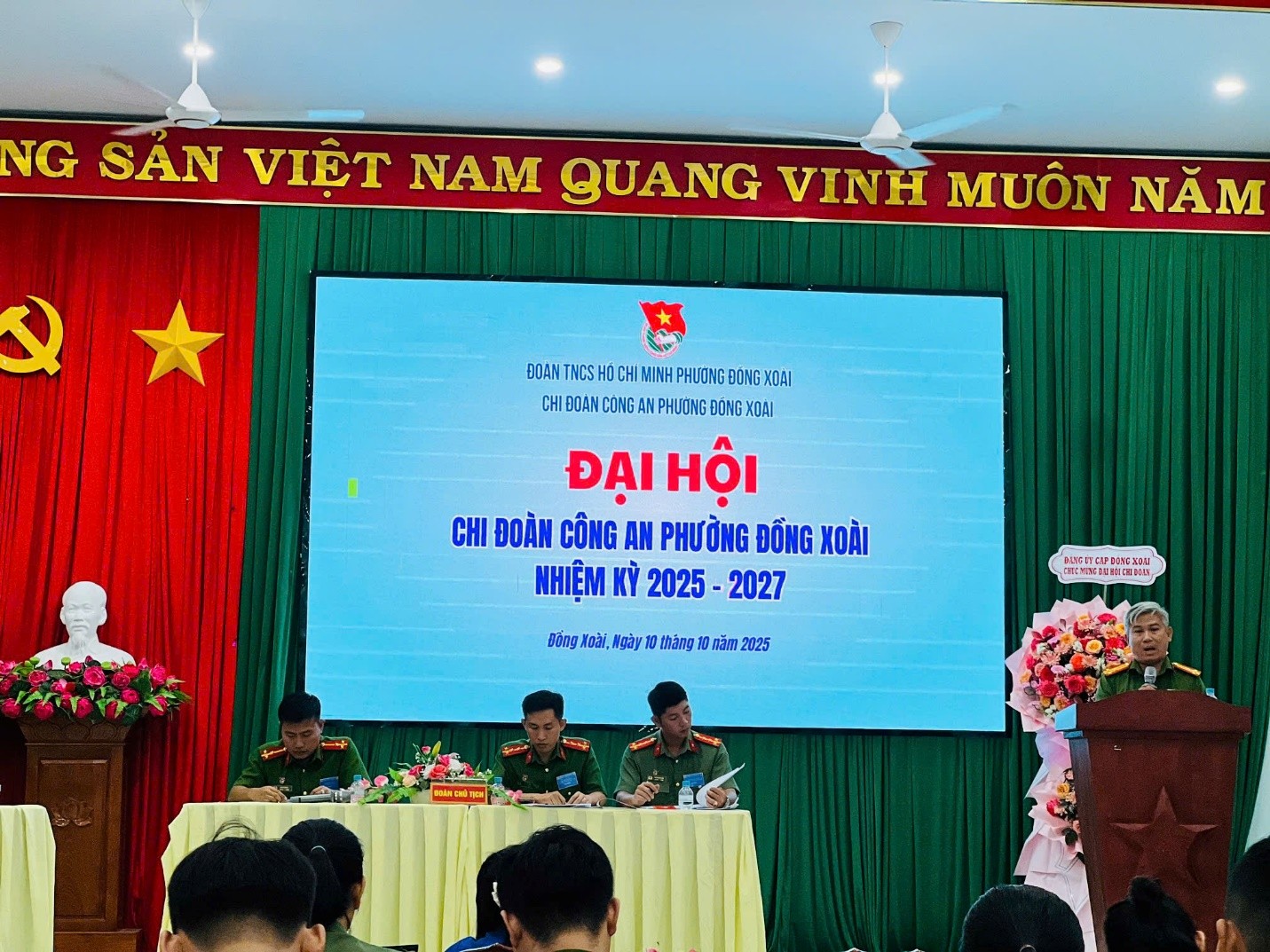Phát biểu chỉ đạo tại Đại hội, đồng chí Thượng tá Lê Thanh Minh – Đảng uỷ viên, Phó bí thư Đảng ủy, Phó Trưởng Công an phường đánh giá cao thành tích của Ban Chấp hành Chi đoàn lâm thời trong thời gian qua và thống nhất cao với phương hướng hoạt động của Chi đoàn trong nhiệm kỳ 2025-2027. Thay mặt Đảng ủy Công an phường, Đ/c Lê Thanh Minh đã đề nghị Chi đoàn Công an phường Đồng Xoài tiếp tục thực hiện có hiệu quả các nhiệm vụ trong nhiệm kỳ 2025-2027 như sau: Tiếp tục đẩy mạnh công tác giáo dục chính trị, tư tưởng, quán triệt sâu sắc Sáu điều Bác Hồ dạy Công an nhân dân, Nghị quyết Đại hội Đoàn các cấp; Phát huy tinh thần xung kích, sáng tạo của tuổi trẻ trong thực hiện nhiệm vụ chuyên môn, gắn phong trào Đoàn với các đợt cao điểm tấn công trấn áp tội phạm, xây dựng phong trào Toàn dân bảo vệ an ninh Tổ quốc; Đổi mới nội dung, hình thức sinh hoạt Đoàn, chú trọng hiệu quả, chiều sâu, gắn hoạt động Đoàn; Tăng cường tinh thần đoàn kết, tương trợ, giúp đỡ nhau trong công tác và cuộc sống, xây dựng tập thể Chi đoàn vững mạnh toàn diện, xứng đáng là lực lượng xung kích tin cậy của Đảng ủy, lãnh đạo Công an phường.
