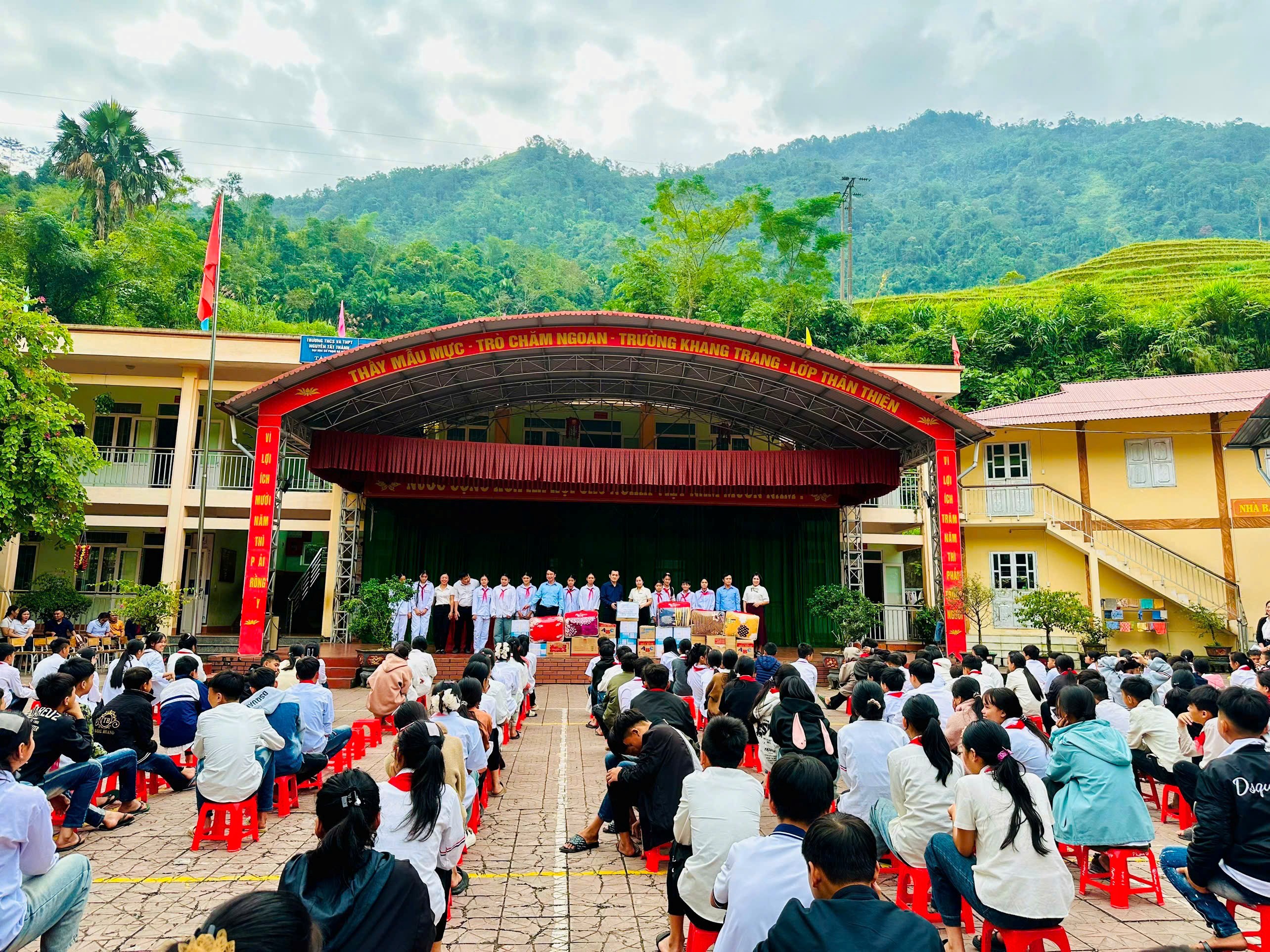 Đồng chí Nguyễn Văn Châu - Bí thư Đảng ủy, Chủ tịch Hội đồng nhân dân xã cùng các đồng chí Ủy viên Ban Thường vụ Đảng ủy xã Cao Bồ, tỉnh Tuyên Quang trực tiếp trao tặng quà cho các em học sinh.
