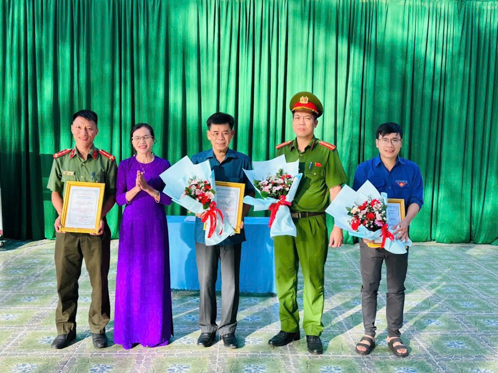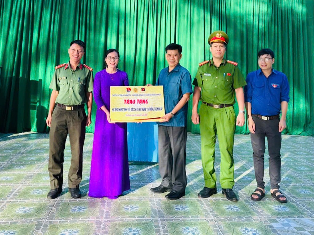 Công an xã và đại diện Ngân hàng Agribank Chi nhánh Tân Thành trao biểu trưng học bổng Chương trình “Tiếp bước em đến trường” cho Trường Trung học cơ sở Minh Lập