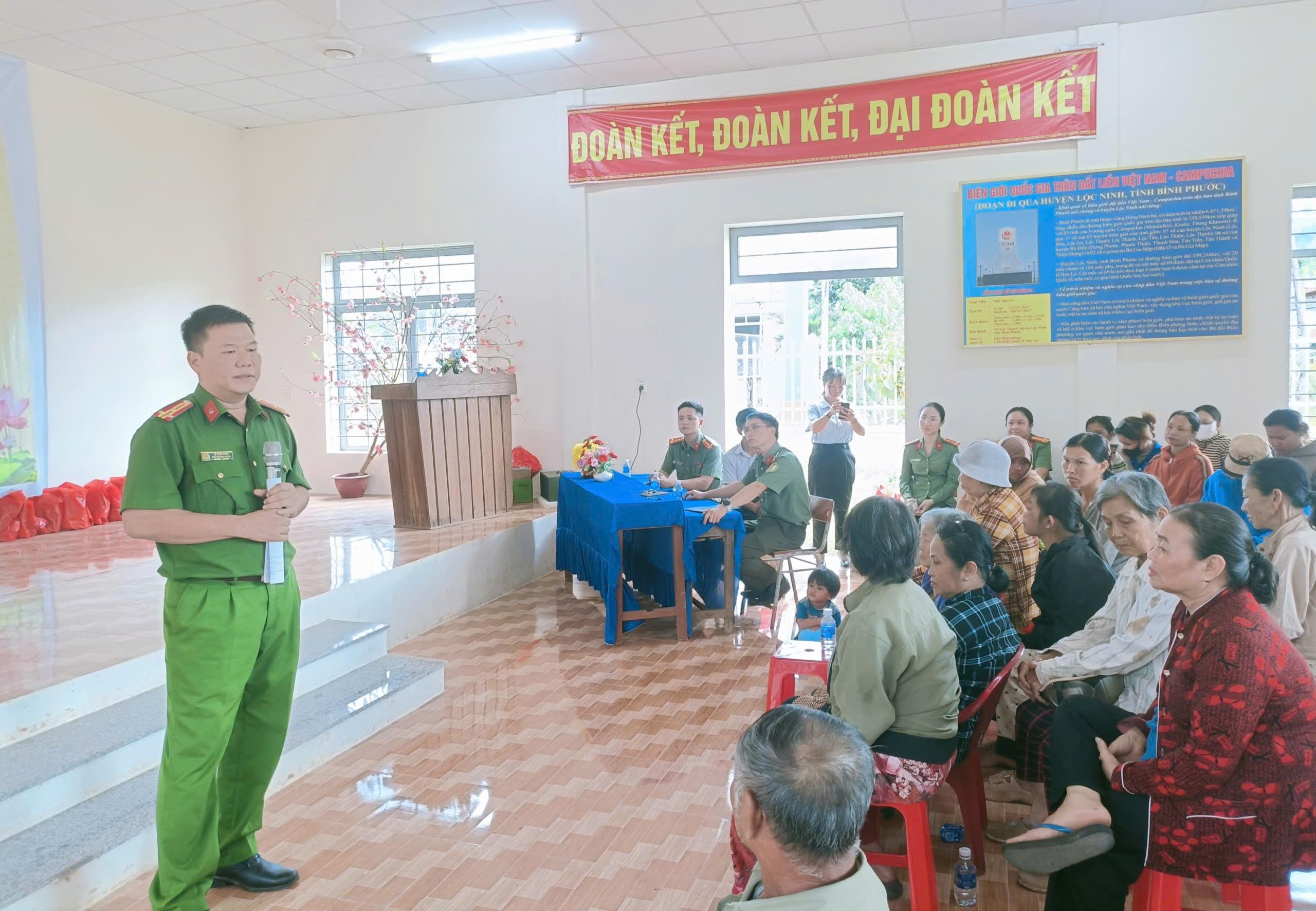 Tại đây, Phòng Quản lý xuất nhập cảnh và Phòng công tác chính trị đã phối hợp cùng các ban, ngành địa phương tổ chức thăm hỏi, trao quà cho 50 hộ gia đình có hoàn cảnh khó khăn, người già neo đơn trên địa bàn xã. Mỗi phần trị giá 300.000đ, gồm có nhu yếu phẩm và tiền mặt, tổng kinh phí quà tặng 15.000.000đ do các đơn vị đóng góp và vận động mạnh thường quân hỗ trợ.