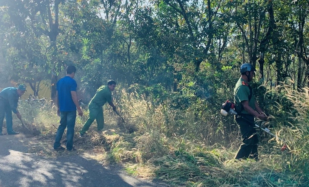 Đoàn viên Công an xã và đoàn viên các chi đoàn tham gia phát quang bụi rậm xung quanh các tuyến đường huyết mạch