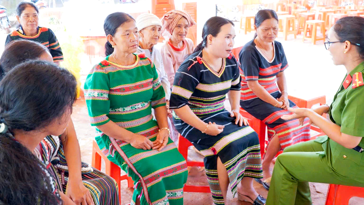 Thượng úy Điểu Thị Hiệp trò chuyện, nắm bắt tâm tư, nguyện vọng của bà con để tìm cách hỗ trợ, tuyên truyền hiệu quả.
