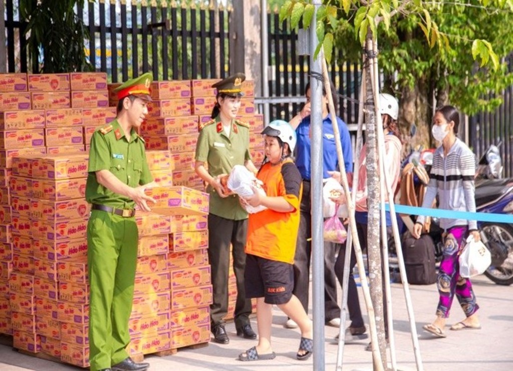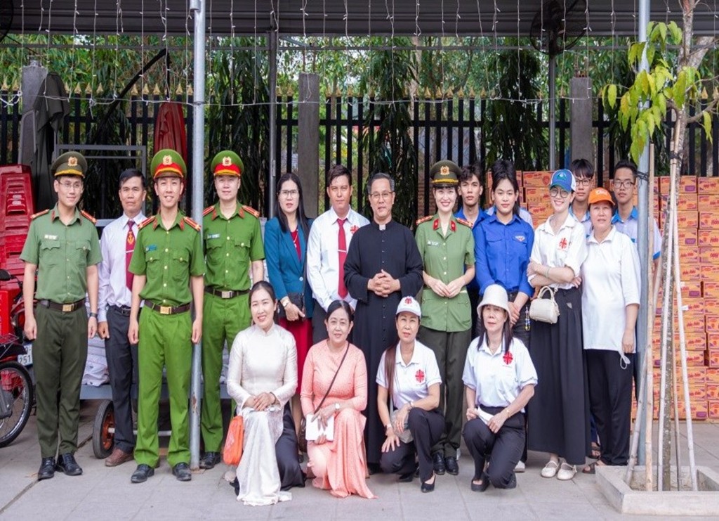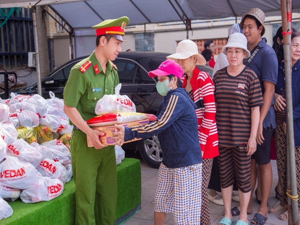 Chi đoàn Công an xã và Giáo họ Long Thọ phối hợp trao quà cho người dân