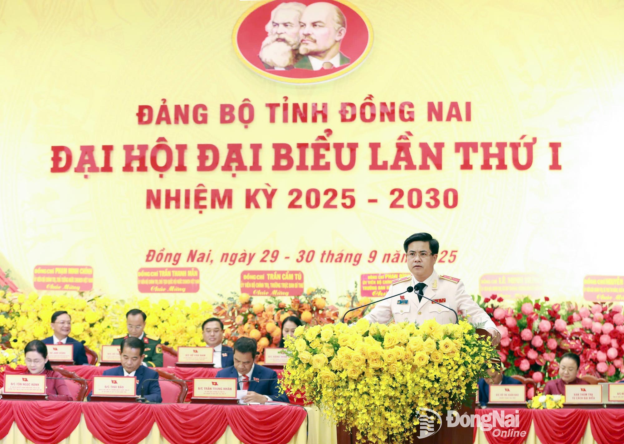 Thiếu tướng Nguyễn Đức Hải, Ủy viên Ban Thường vụ Tỉnh ủy, Giám đốc Công an tỉnh chủ trì phiên thảo luận tại Đại hội đại biểu Đảng bộ tỉnh Đồng Nai lần thứ I, nhiệm kỳ 2025-2030. Ảnh: Huy Anh