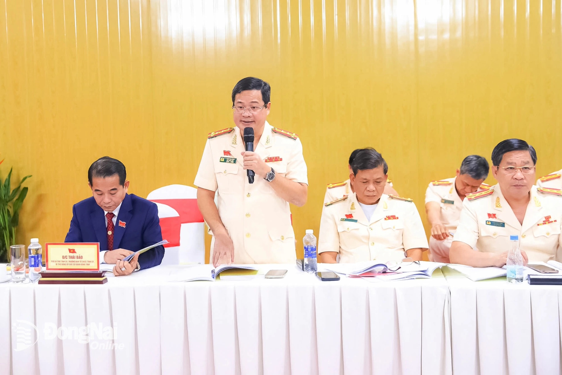 Thiếu tướng Nguyễn Đức Hải, Ủy viên Ban Thường vụ Tỉnh ủy, Giám đốc Công an tỉnh Đồng Nai trình bày tham luận về “Giữ vững an ninh chính trị, đảm bảo trật tự an toàn xã hội, xây dựng lực lượng công an Đồng Nai “chính quy, tinh nhuệ, hiện đại” đáp ứng yêu cầu, nhiệm vụ trong tình hình mới”. Ảnh: Huy Anh