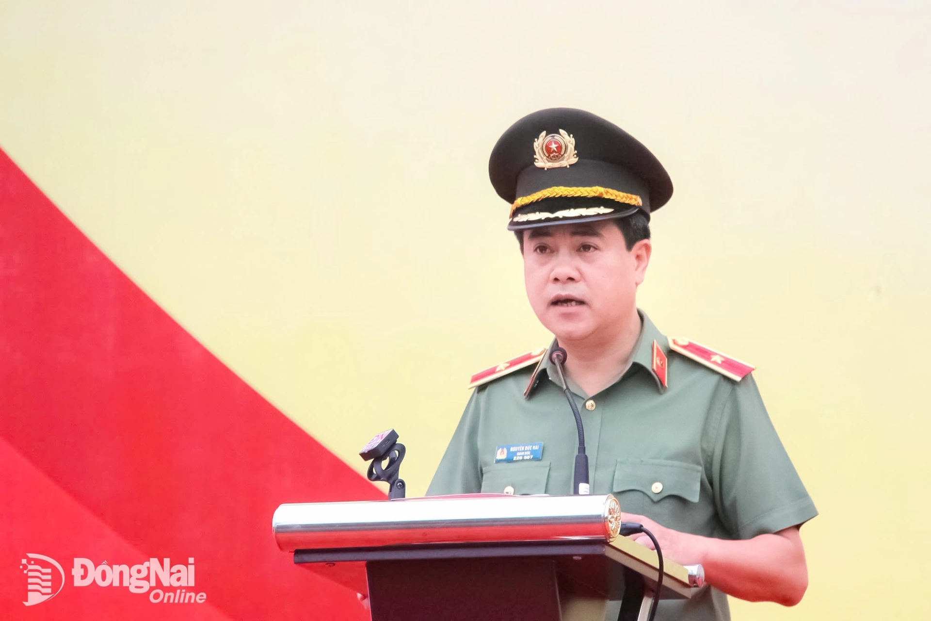 Thiếu tướng Nguyễn Đức Hải, Ủy viên Ban Thường vụ Tỉnh ủy, Giám đốc Công an tỉnh phát biểu tại Lễ ra quân bảo vệ Đại hội Đảng bộ tỉnh Đồng Nai lần thứ I, nhiệm kỳ 2025-2030. Ảnh: Trần Danh