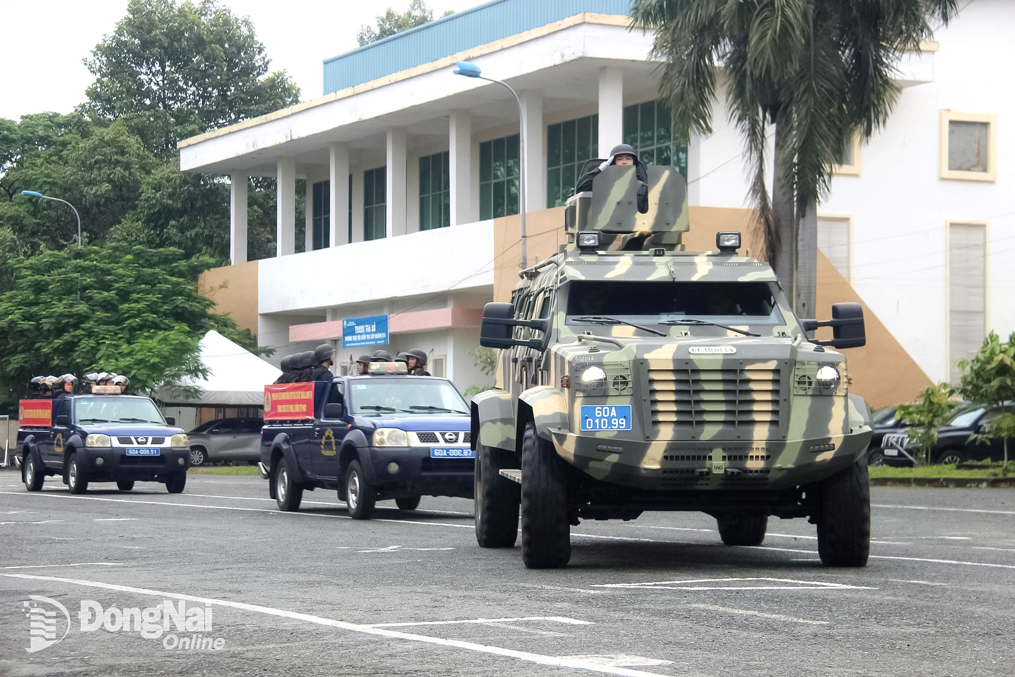Công an tỉnh triển khai các phương tiện tham gia bảo vệ Đại hội đại biểu Đảng bộ tỉnh Đồng Nai lần thứ I, nhiệm kỳ 2025-2030. Ảnh: Trần Danh
