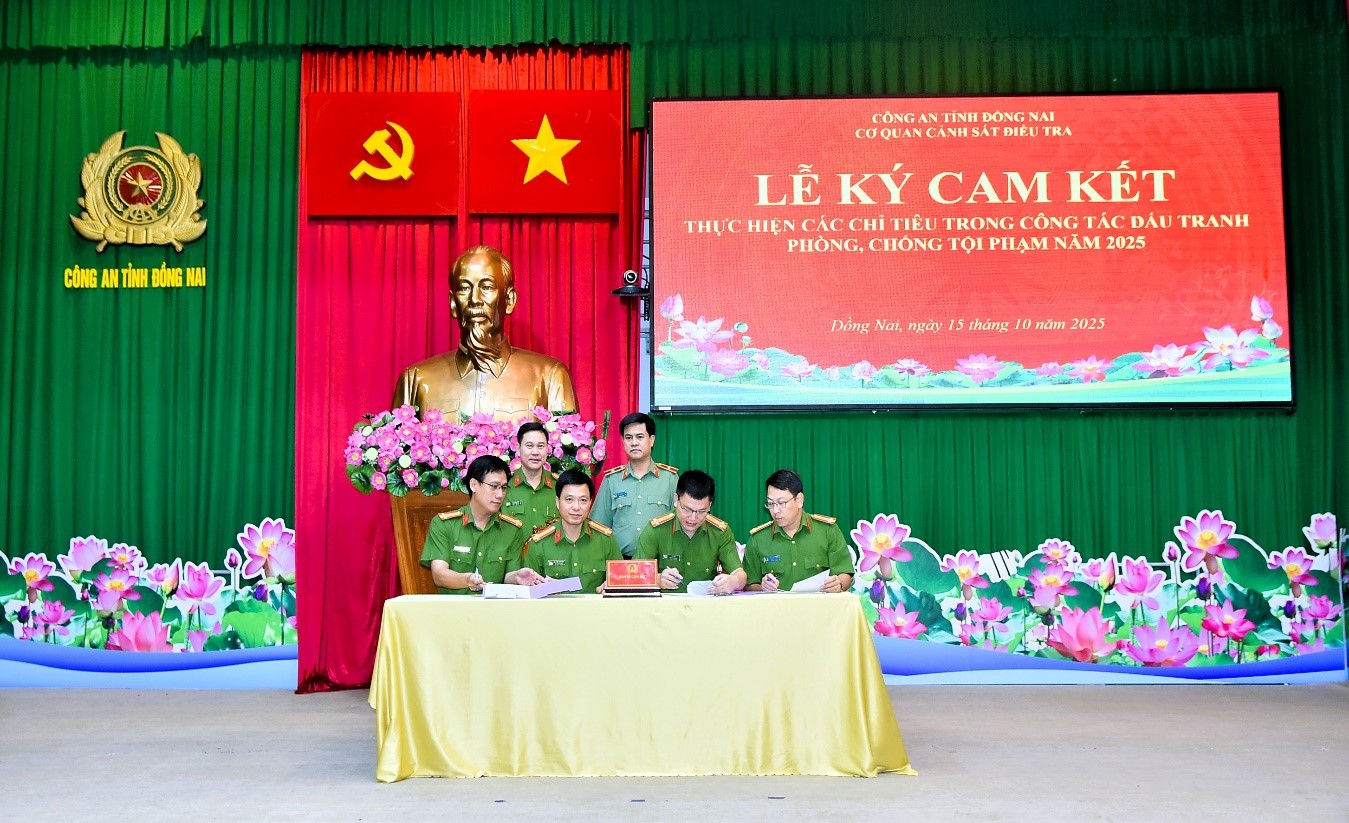 Đồng chí Giám đốc và Phó Giám đốc Công an tỉnh chứng kiến các đơn vị nghiệp vụ khối CQCSĐT ký cam kết thực hiện chỉ tiêu công tác.