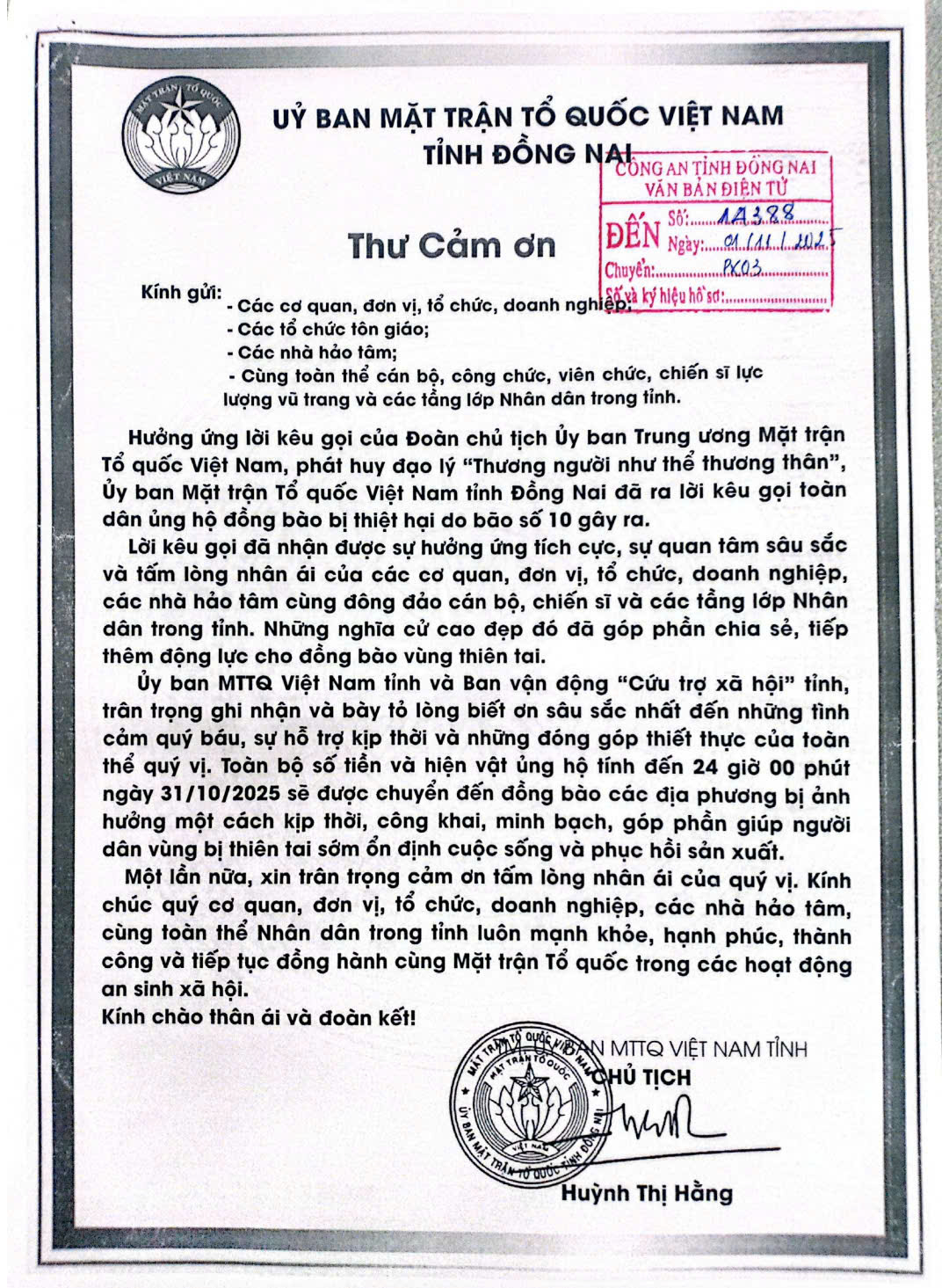 Công an tỉnh vừa nhận được Thư cảm ơn của Uỷ ban Mặt trận Tổ quốc Việt Nam tỉnh Đồng Nai vì đã quyên góp, ủng hộ đồng bào bị thiệt hại do bão số 10 gây ra.