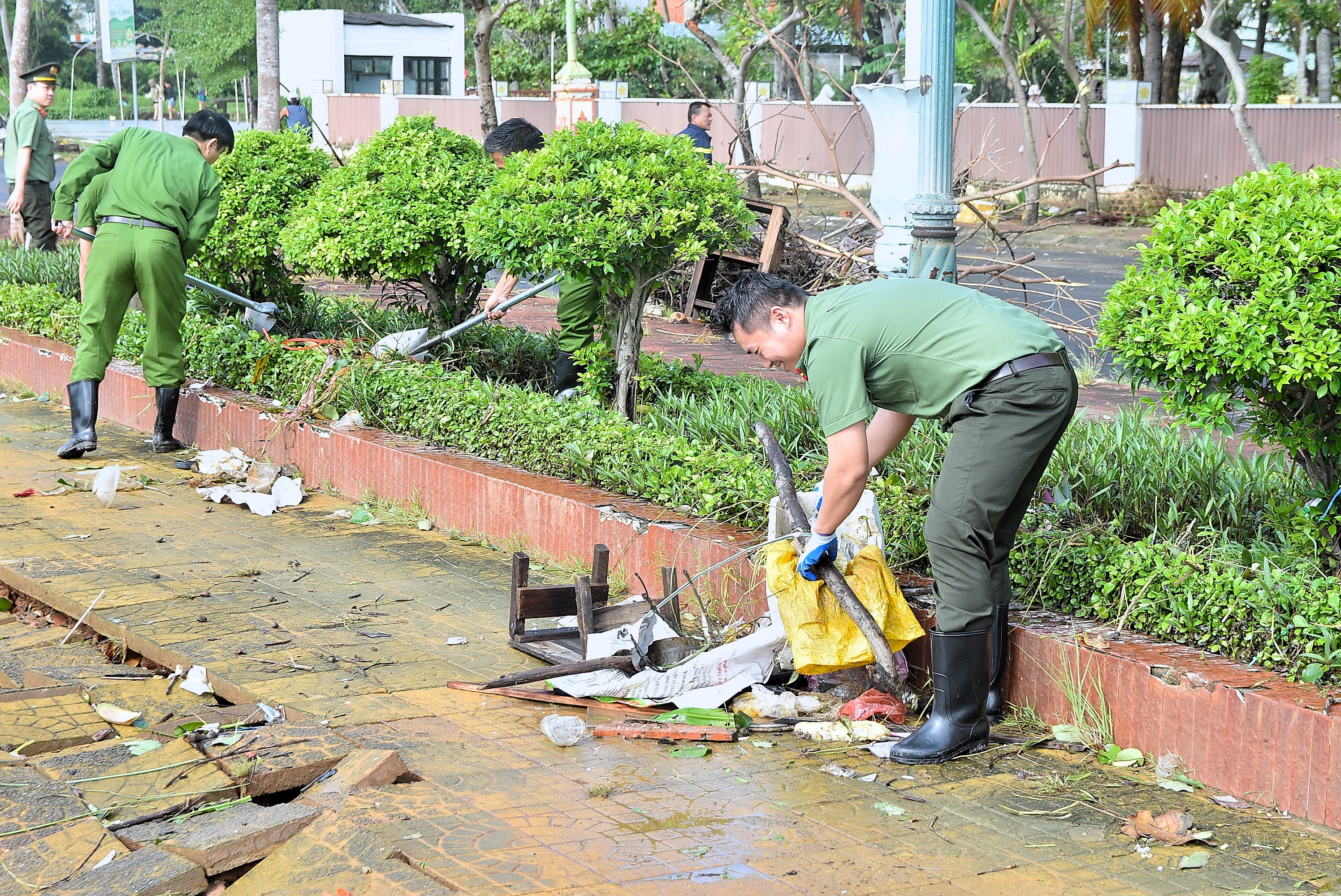 Tính đến 17 giờ chiều cùng ngày, các Tiểu đội của Công an tỉnh đã dọn dẹp được khoảng gần 20 tấn rác thải, đất đá, cành cây, bùn non.. với tuyến đường khoảng 7km, gần 200 cây xanh bị gãy đổ ngã chắn lối đi trong nội ô phường Tuy Hòa đã được CBCS dùng cưa tỉa gọn, cũng như rác bùn đất tập kết để xe môi trường vận chuyển đến các vị trí quy định.
