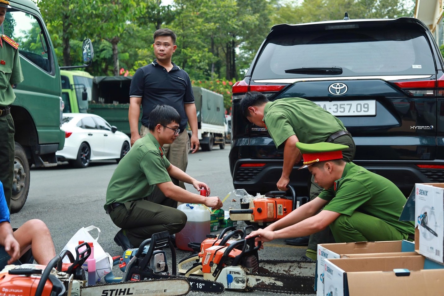 Cán bộ, chiến sĩ chuẩn bị phương tiện, dụng cụ hỗ trợ chuẩn bị cho chuyến cứu trợ