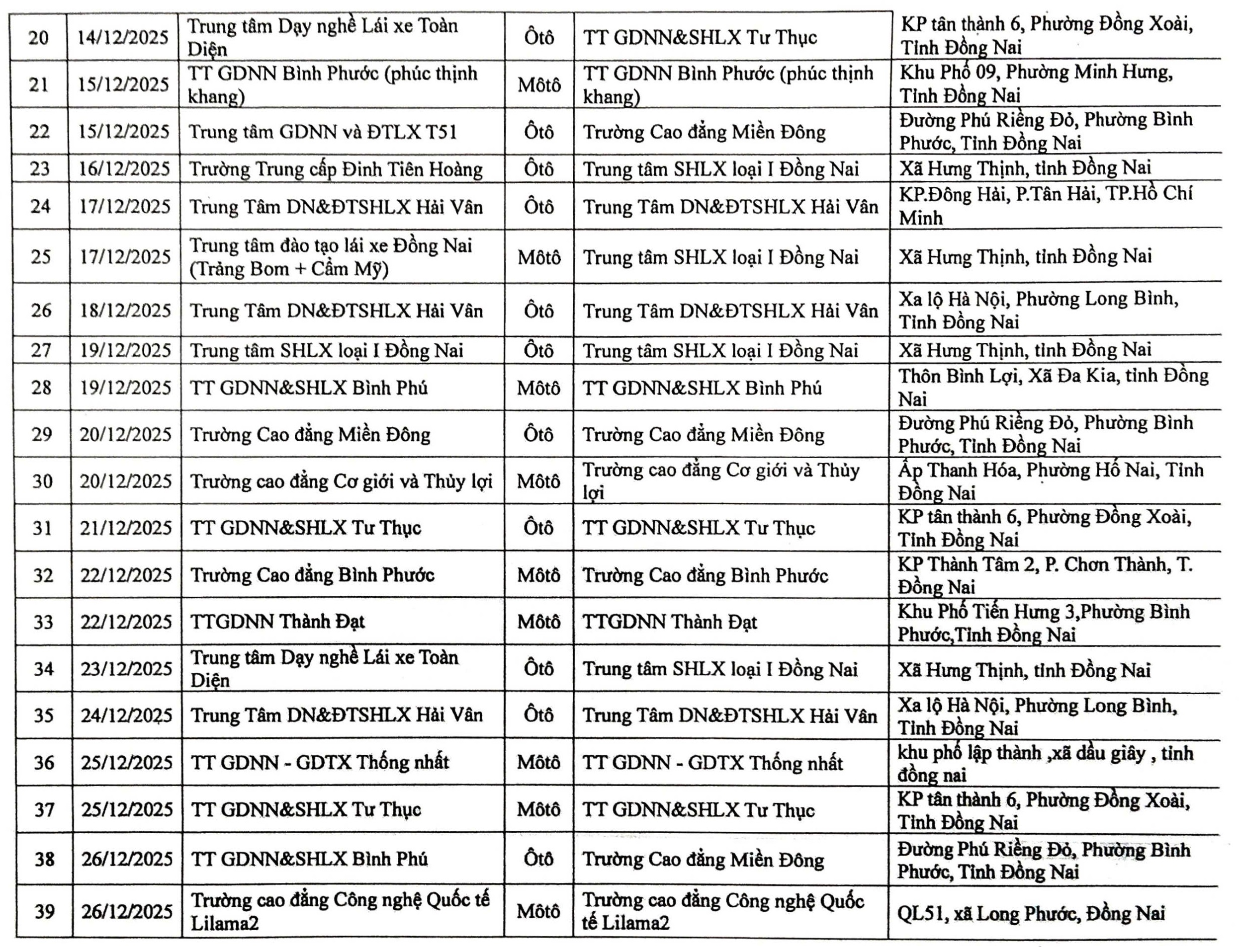 Phòng Cảnh sát Giao thông, Công an tỉnh Đồng Nai trân trọng thông báo thời gian, địa điểm thực hiện sát hạch Giấy phép lái xe tháng 12 năm 2025 như sau: