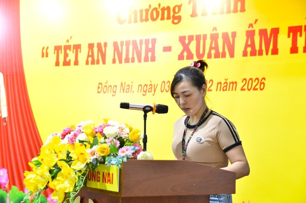 Đại diện Công nhân Công ty TNHH Pou Chen Việt Nam phát biểu cảm ơn tình cảm quý báu của Công an tỉnh Đồng Nai