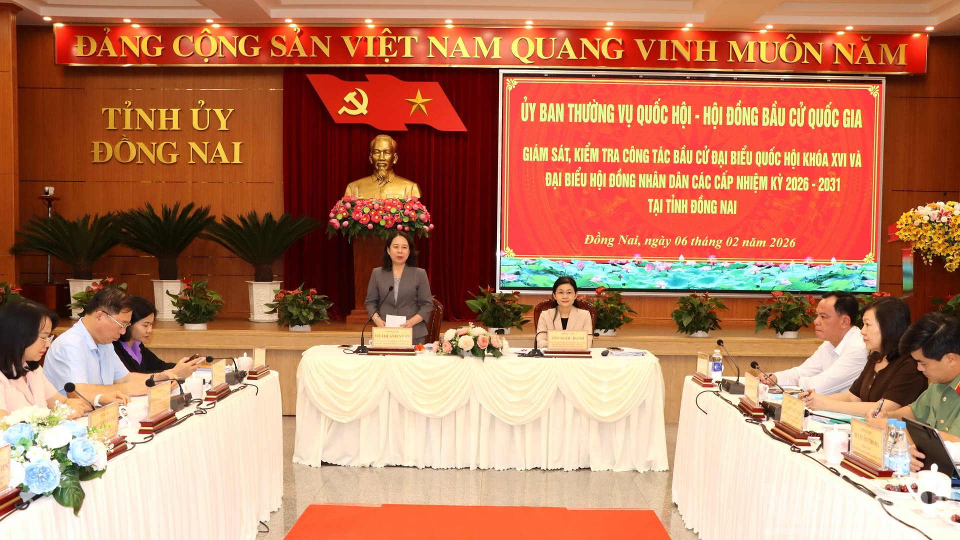 Phó Chủ tịch nước Võ Thị Ánh Xuân đề nghị Ban Thường vụ Tỉnh ủy và Ủy ban bầu cử tỉnh Đồng Nai cần tiếp tục xác định cuộc bầu cử đại biểu Quốc hội khóa XVI và đại biểu hội đồng nhân dân các cấp nhiệm kỳ 2026-2031 là nhiệm vụ chính trị trọng tâm, ưu tiên hàng đầu, tập trung tăng cường lãnh đạo, chỉ đạo công tác triển khai chặt chẽ, đúng luật, đúng tiến độ các bước từ nay đến ngày bầu cử và sau bầu cử.