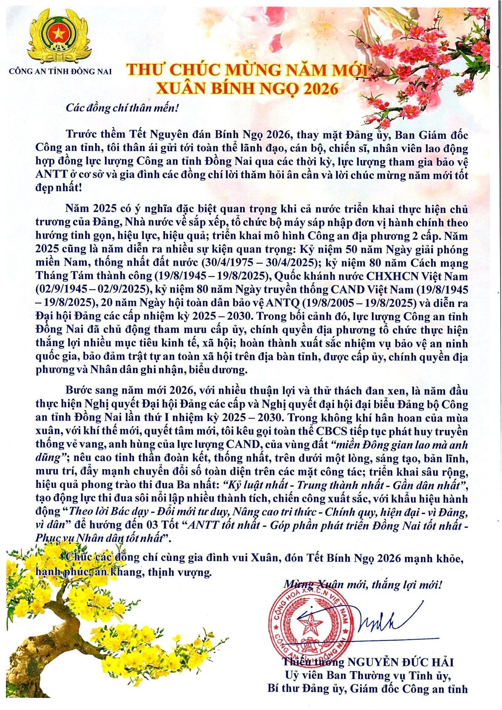 Trước thềm năm mới Xuân Bính Ngọ 2026, thay mặt Đảng ủy, Ban Giám đốc Công an tỉnh, đồng chí Giám đốc Công an tỉnh đã gửi Thư chúc mừng năm mới gửi đến toàn thể lãnh đạo, cán bộ, chiến sĩ, nhân viên lao động hợp đồng, lực lượng Công an tỉnh Đồng Nai qua các thời kỳ, lực lượng tham gia bảo vệ ANTT ở cơ sở và gia đình...
