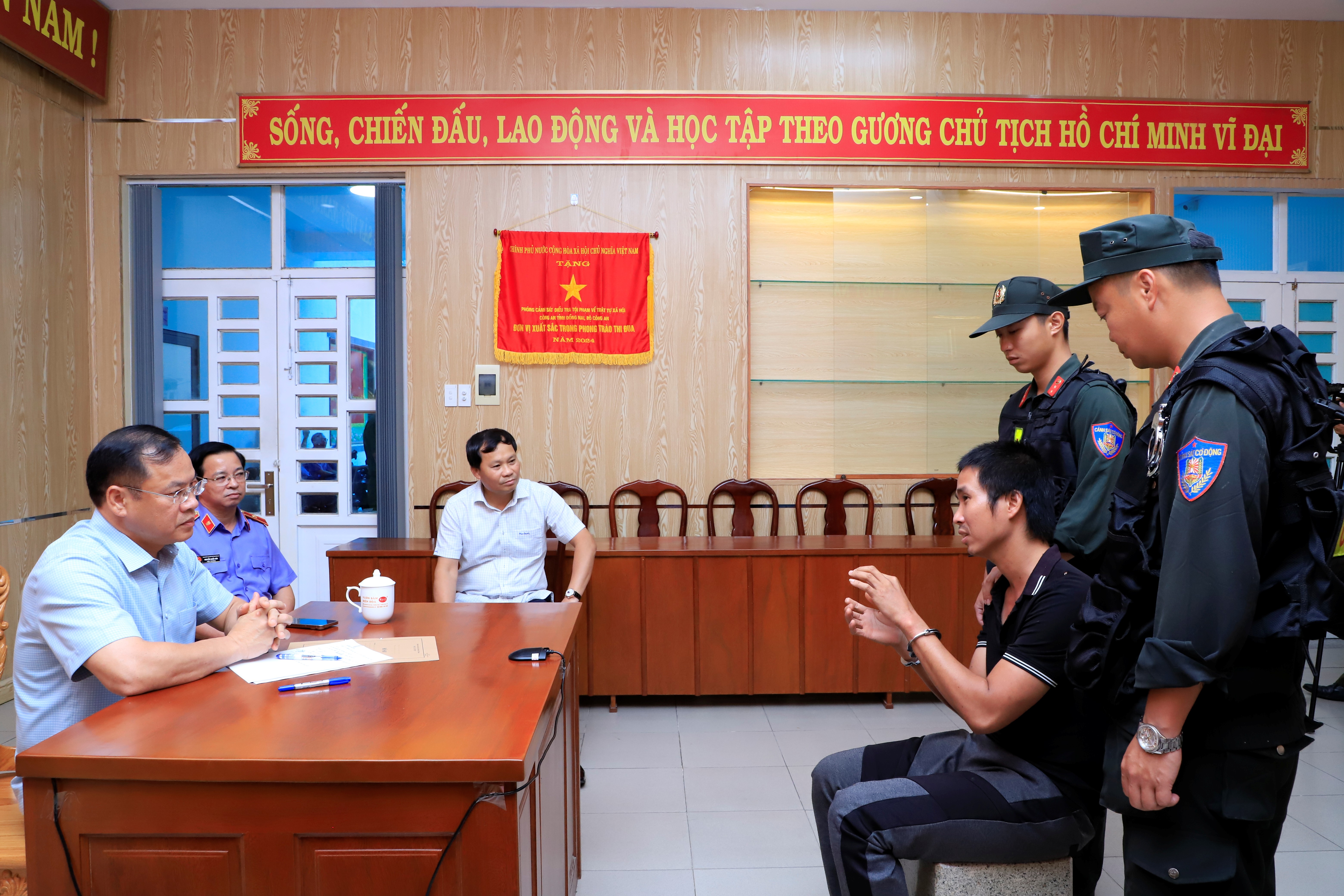 Thượng tướng Nguyễn Văn Long, Thứ trưởng, Thủ trưởng Cơ quan Cảnh sát điều tra Bộ Công an lấy lời khai đối tượng Lê Sỹ Tùng, thủ phạm gây ra vụ án giết 3 người tại xã Đăk Nhau, tỉnh Đồng Nai