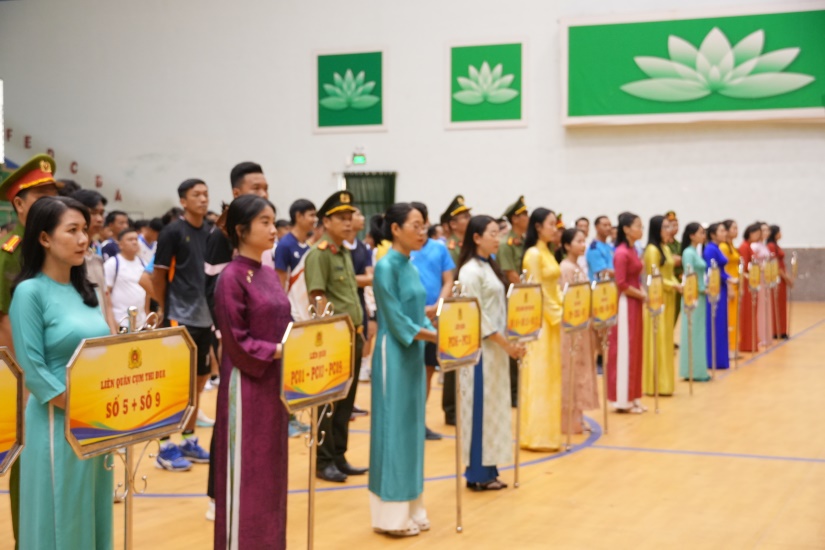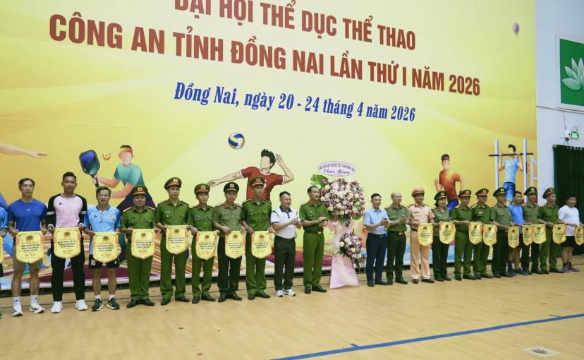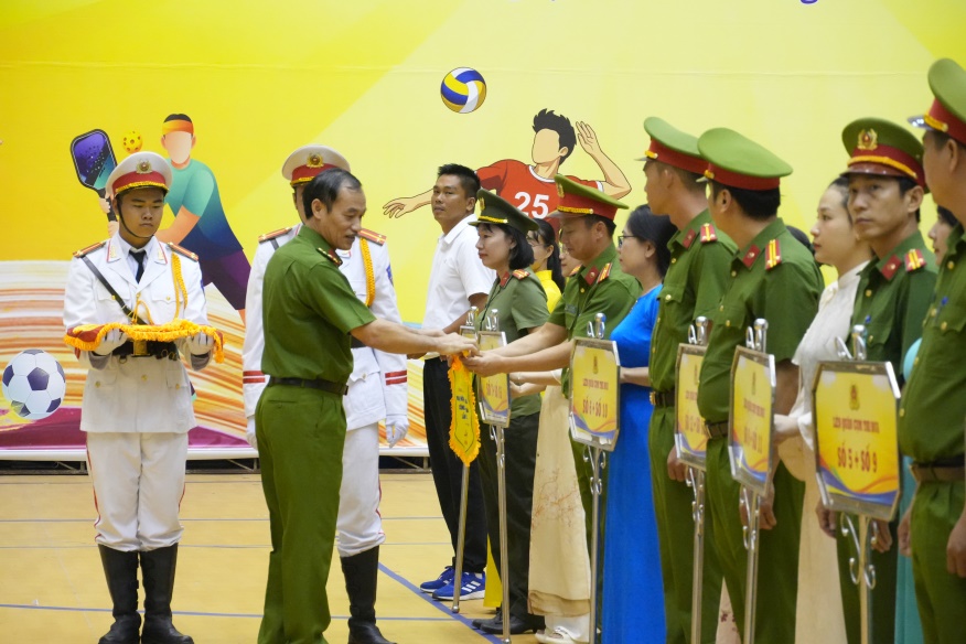 Lãnh đạo Công an tỉnh, lãnh đạo Trung tâm Huấn luyện và thi đấu thể thao tỉnh, Sở VHTT và DL tỉnh Đồng Nai trao cờ lưu niệm cho các Đoàn