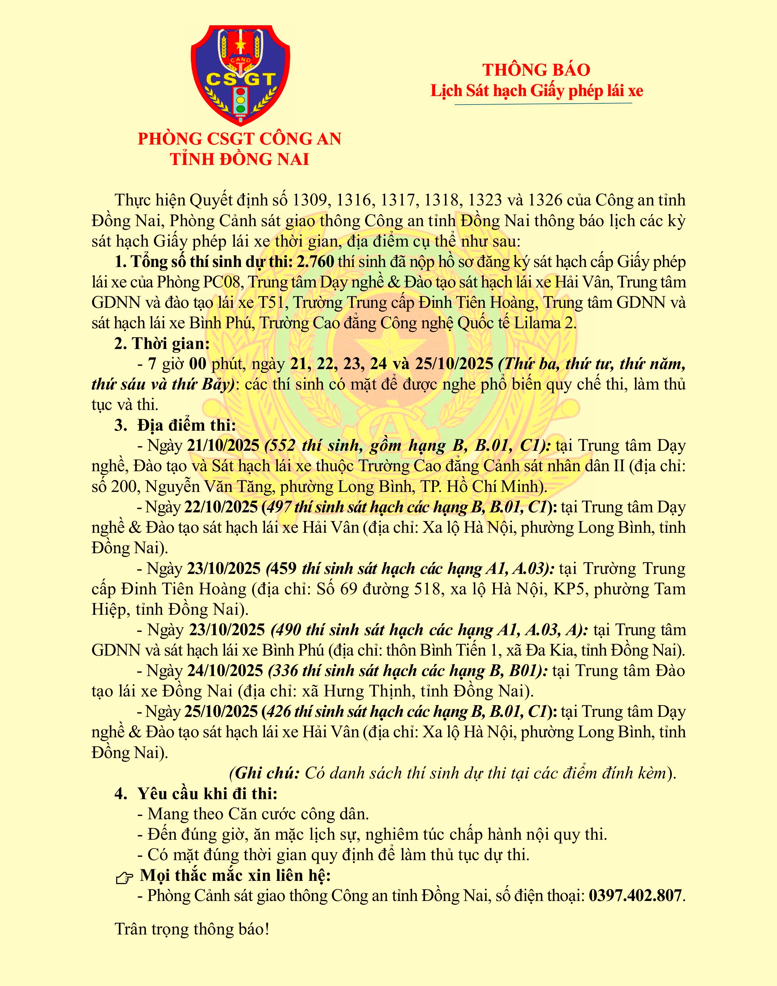 Phòng Cảnh sát giao thông, Công an tỉnh Đồng Nai trân trọng thông báo thời gian, địa điểm thực hiện sát hạch Giấy phép lái xe, cụ thể như sau: