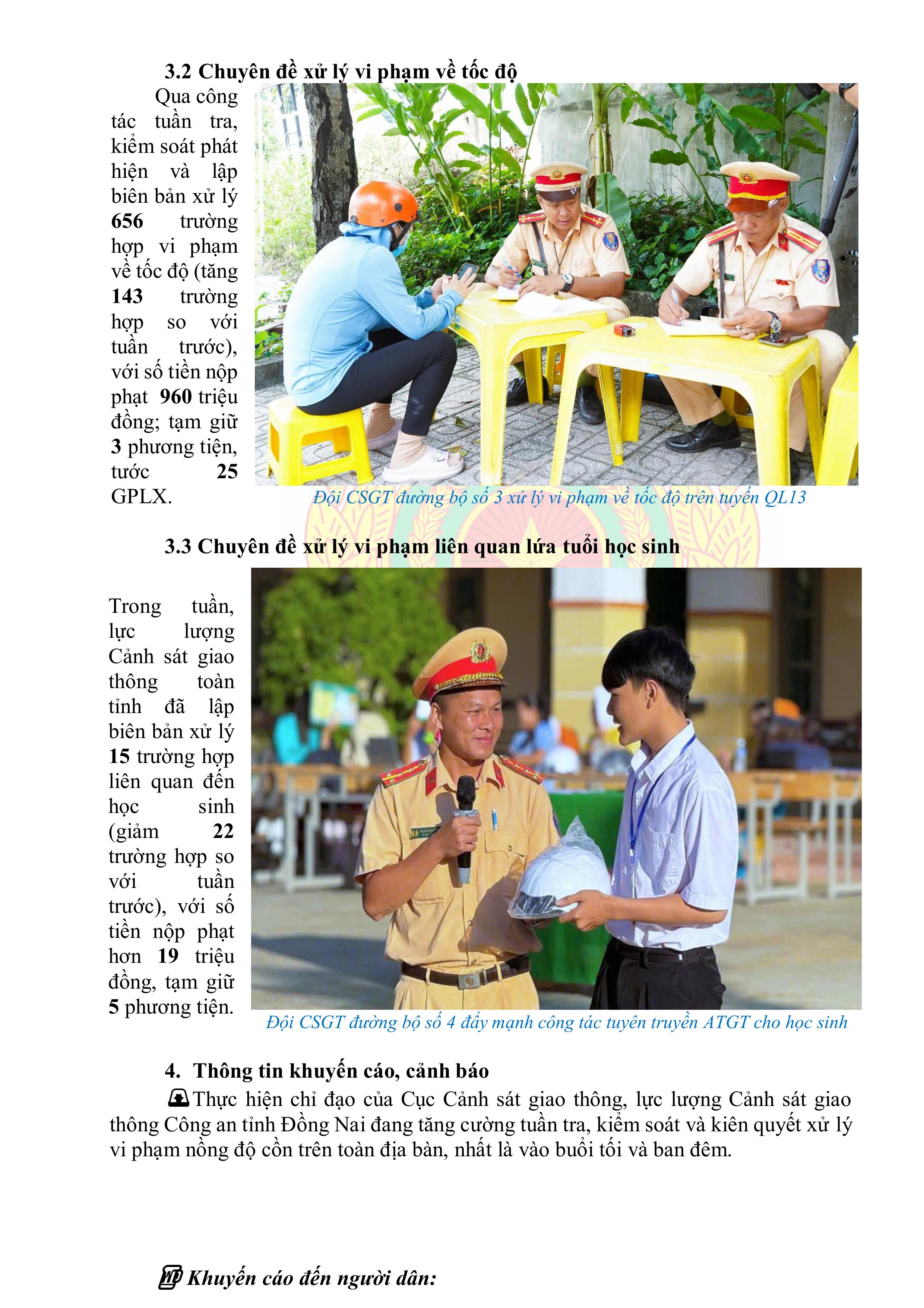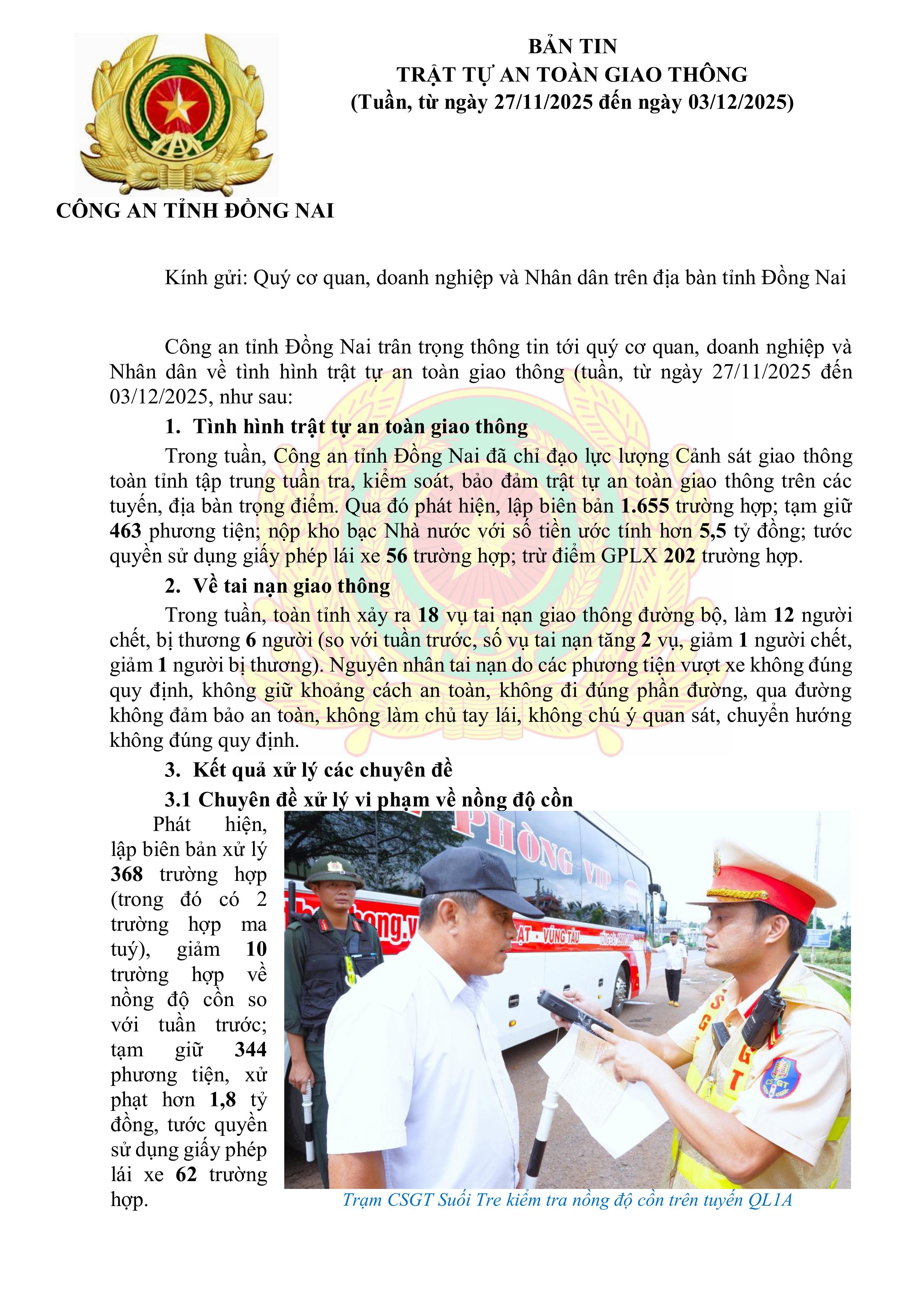 Công an tỉnh Đồng Nai trân trọng thông tin tới quý cơ quan, doanh nghiệp và nhân dân tình hình Trật tự an toàn giao thông trên địa bàn tỉnh tuần qua.