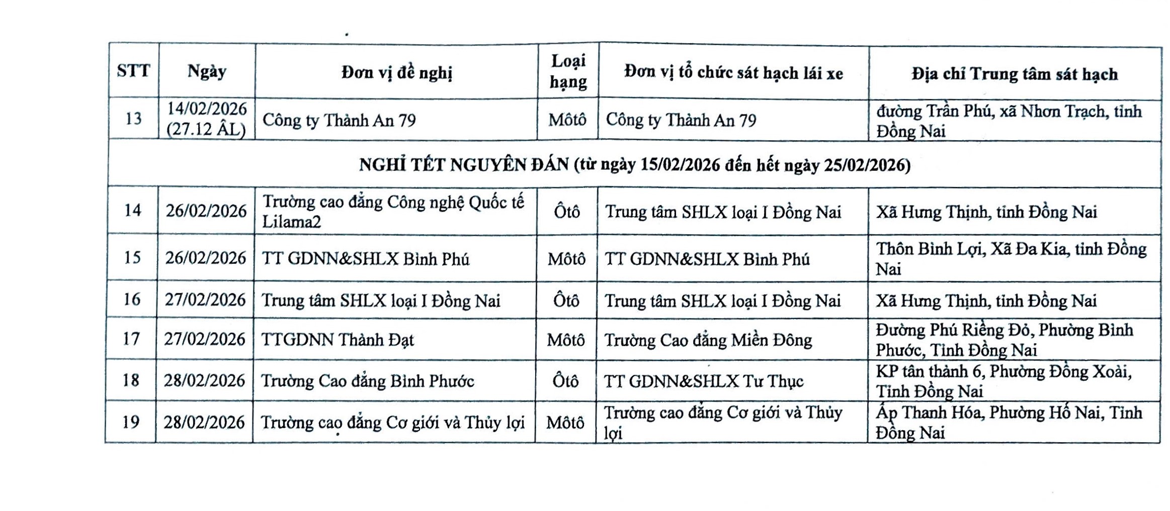 Phòng Cảnh sát Giao thông Công an tỉnh Đồng Nai trân trọng thông báo lịch sát hạch lái xe tháng 2/2026, thời gian, địa điểm cụ thể như sau: