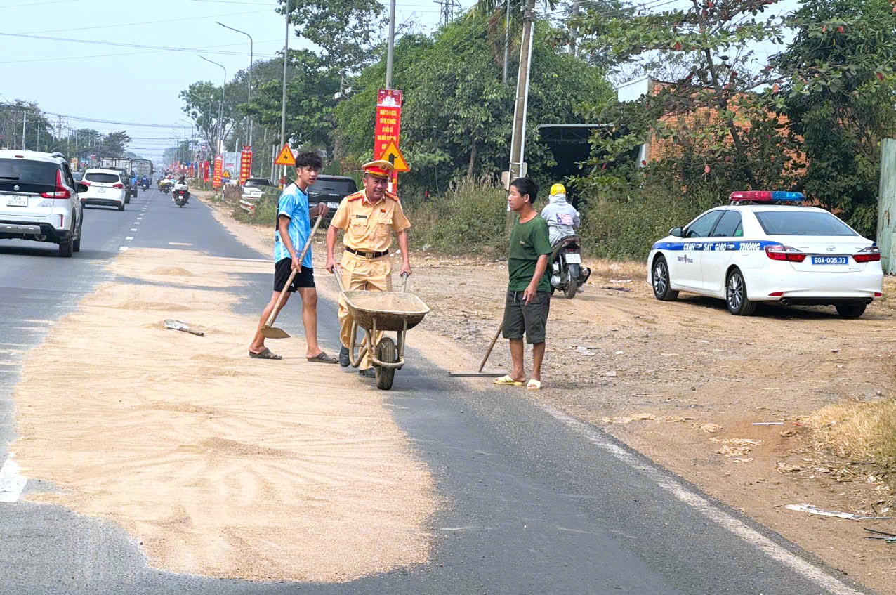 Ngay sau khi phát hiện, Thượng tá Trần Hữu Dũng cùng tổ tuần tra đã nhanh chóng dừng kiểm tra hiện trường, chủ động mượn dụng cụ của người dân khu vực lân cận để trực tiếp thu gom, dọn sạch lượng cát tràn ra mặt đường. Sau thời gian ngắn xử lý, mặt đường được trả lại thông thoáng, bảo đảm an toàn cho các phương tiện tiếp tục lưu thông.