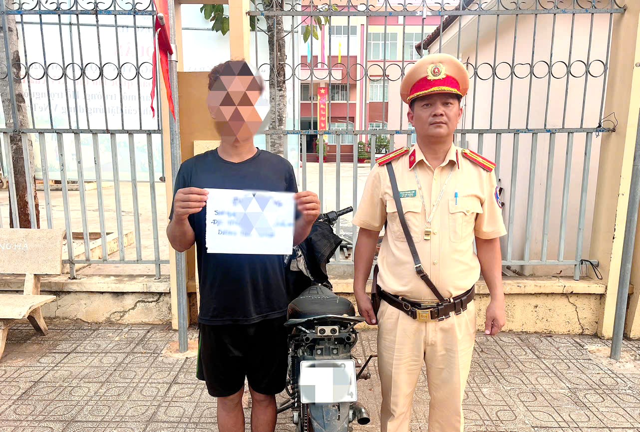 Cụ thể, khoảng 17 giờ cùng ngày, Tổ tuần tra kiểm soát thuộc Đội CSGT đường bộ số 4 làm nhiệm vụ trên tuyến đường ĐT.757, đoạn qua xã Long Hà thì phát hiện nam thanh niên điều khiển xe mô tô biển số 93P2-457.xx vi phạm lỗi không có gương chiếu hậu bên trái nên tiến hành dừng phương tiện kiểm tra.