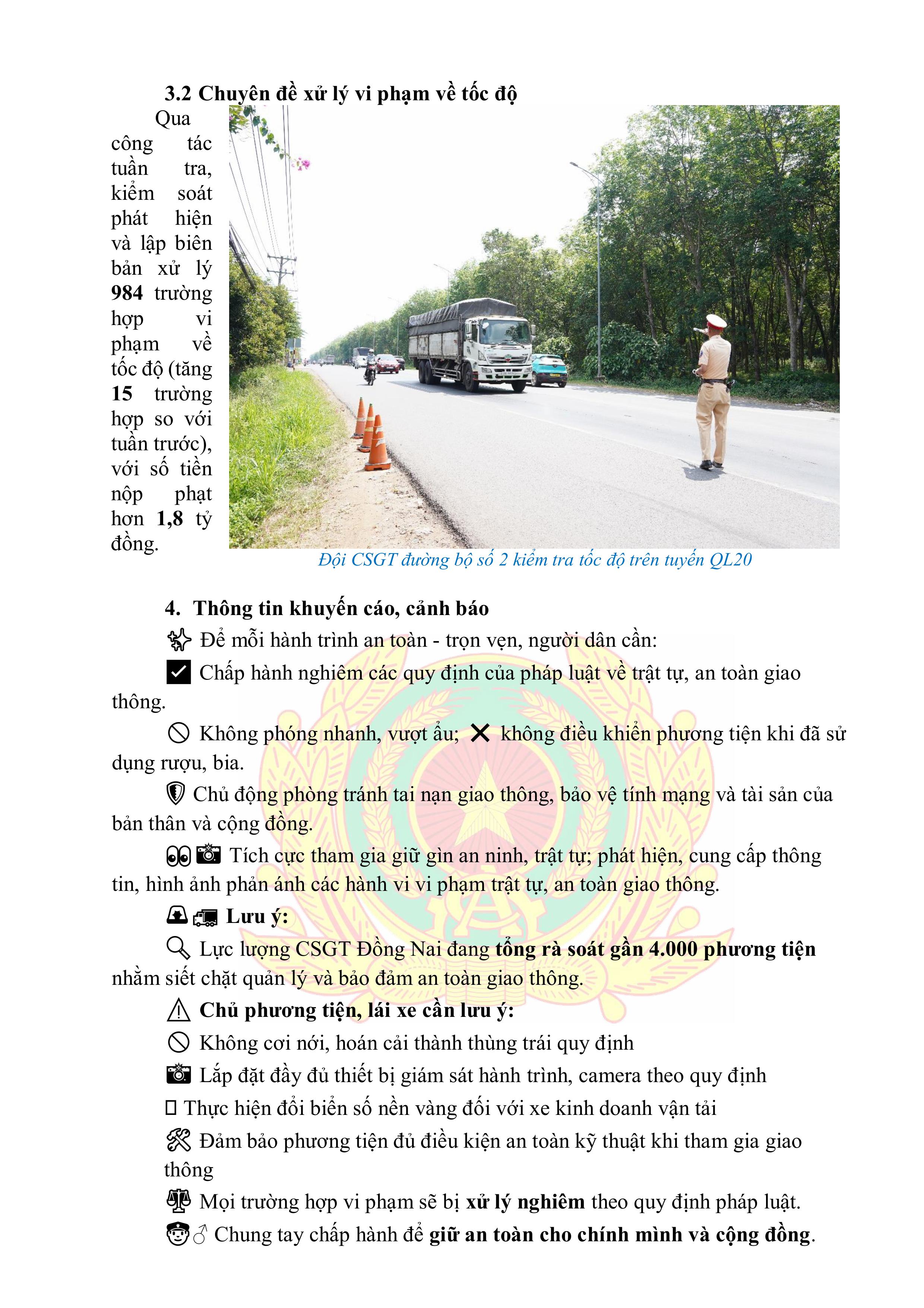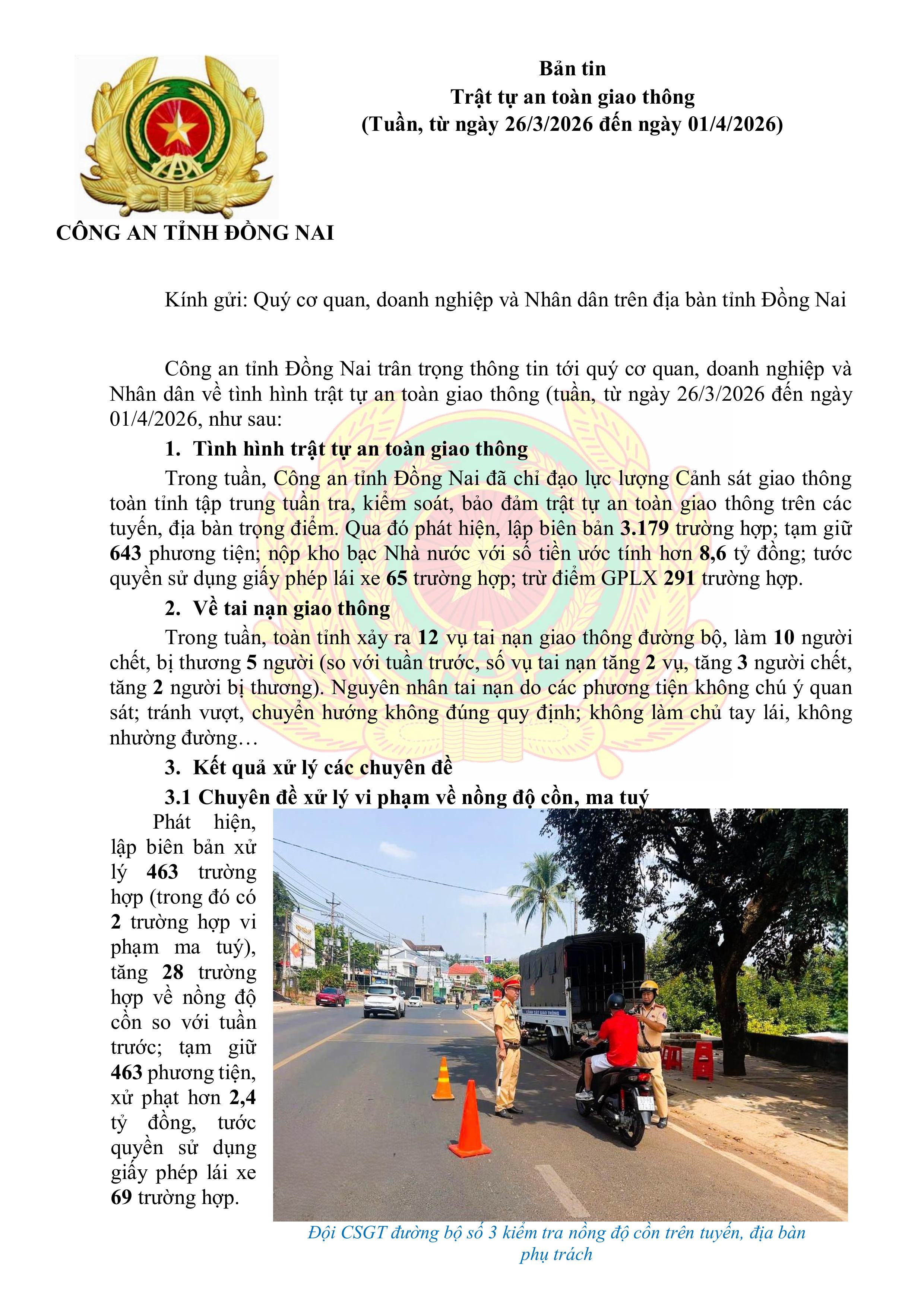 Công an tỉnh Đồng Nai trân trọng thông tin tới quý cơ quan, doanh nghiệp và Nhân dân về tình hình trật tự an toàn giao thông (tuần, từ ngày 26/3/2026 đến ngày 01/4/2026, như sau: