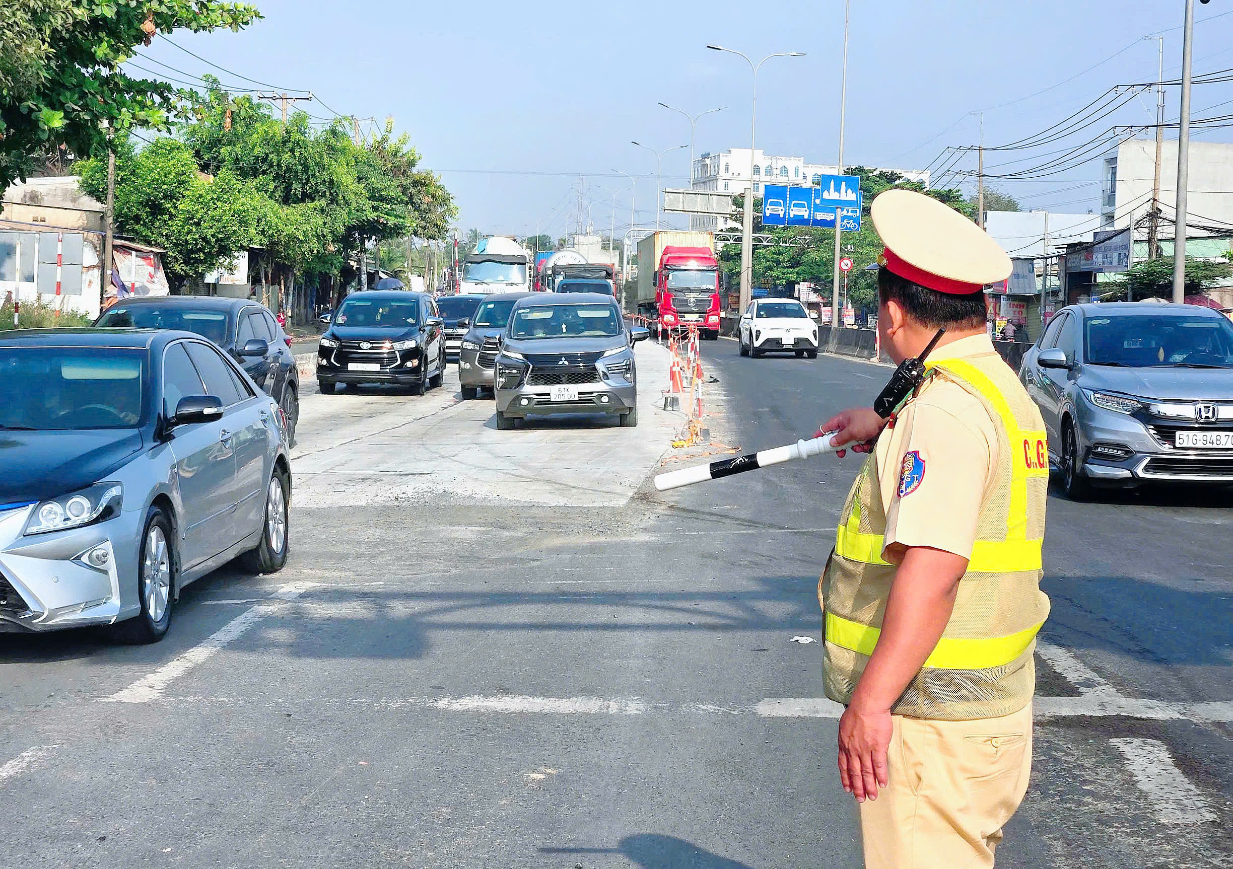 Ghi nhận tại hiện trường, dưới cái nắng gay gắt, mặt đường hắt nhiệt, dòng phương tiện nối dài qua các khu vực thi công, lực lượng làm nhiệm vụ vẫn kiên trì bám trụ, điều tiết giao thông liên tục trong nhiều giờ. Có thời điểm, cán bộ, chiến sĩ phải đứng làm nhiệm vụ dưới nền nhiệt cao, trang phục ướt đẫm mồ hôi nhưng vẫn tập trung hướng dẫn, điều hòa từng dòng xe di chuyển an toàn. Trong điều kiện vừa thi công, vừa khai thác, mặt đường bị thu hẹp, tiềm ẩn nhiều nguy cơ mất an toàn, song các cán bộ, chiến sĩ vẫn nỗ lực giữ cho tuyến giao thông thông suốt, hạn chế thấp nhất nguy cơ xảy ra tai nạn.