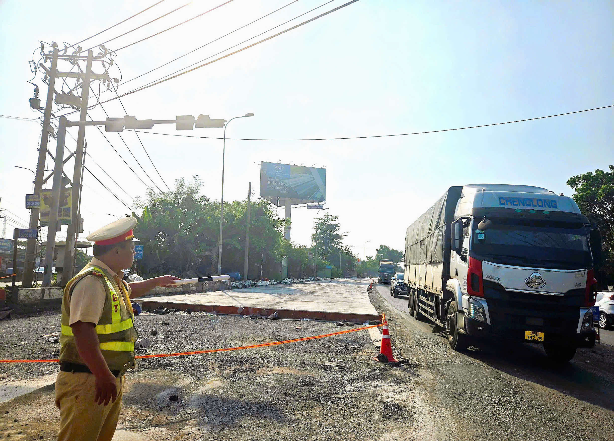Lực lượng CSGT Ngã ba Thái Lan điều tiết giao thông tại các điểm đang sửa chữa