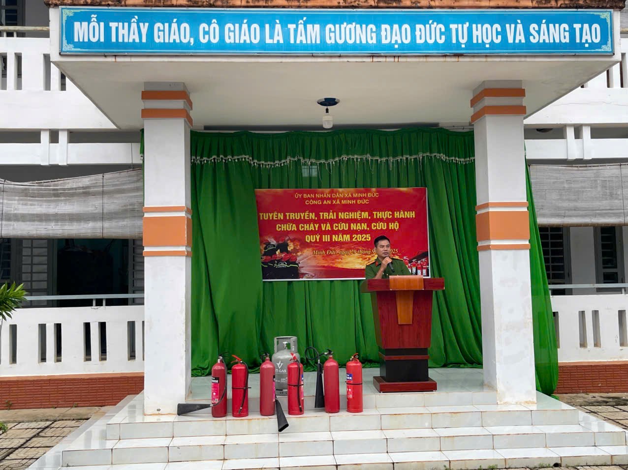 Trong chương trình, các em học sinh, thầy cô và nhân viên nhà trường đã được cán bộ Công an xã Minh Đức giới thiệu những kiến thức cơ bản về nguyên nhân và nguy cơ gây cháy, nổ; kỹ năng phòng ngừa, xử lý tình huống khi có sự cố cháy, nổ xảy ra; thực hành sử dụng bình chữa cháy, kỹ năng thoát hiểm và sơ cứu ban đầu khi có tai nạn. Hoạt động diễn ra sôi nổi, thiết thực, giúp các em học sinh được trải nghiệm thực tế, nâng cao kỹ năng ứng phó tình huống khẩn cấp, đồng thời góp phần lan tỏa ý thức phòng cháy, chữa cháy trong cộng đồng.