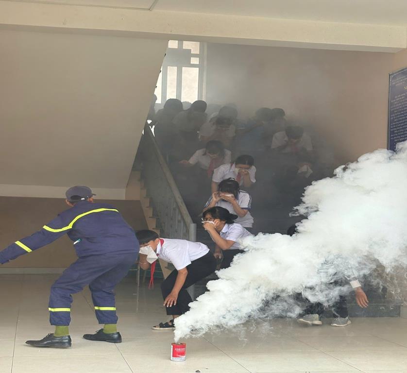 Ngoài ra, học sinh còn được thực hành, trải nghiệm thực tế nhiều nội dung thiết thực như: Thực hành sử dụng bình chữa cháy xách tay dập tắt đám cháy do rò rỉ gas; Trải nghiệm thoát nạn bằng xe thang, di chuyển người bằng tay không trong môi trường có khói; Thực hành rải vòi chữa cháy, phun nước tiêu điểm, thoát nạn trong không gian hạn chế; Thực hành kỹ năng sơ cứu ban đầu cho người bị nạn như ép tim ngoài lồng ngực, hô hấp nhân tạo, di chuyển người bị nạn an toàn.