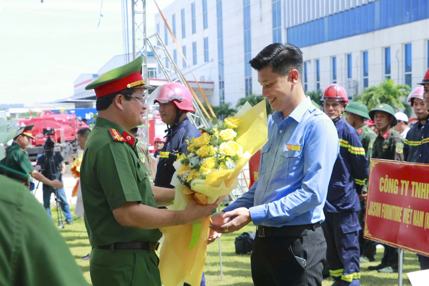 Buổi diễn tập huy động 1 xe chỉ huy, 2 xe thang, 10 xe chữa cháy chuyên dụng, 3 xe bồn, 1 robot chữa cháy cùng nhiều phương tiện cơ giới khác cùng với trên 300 người tham gia từ Công an tỉnh, Bộ Chỉ huy Quân sự tỉnh, Sở Y tế, Đội PCCC chuyên ngành,… Các lực lượng nhanh chóng phối hợp xử lý tình huống một cách đồng bộ, nhanh chóng khống chế đám cháy, đồng thời đưa những người mắc kẹt trong toà nhà ra ngoài an toàn. Công tác sơ cứu, cấp cứu được triển khai hiệu quả.