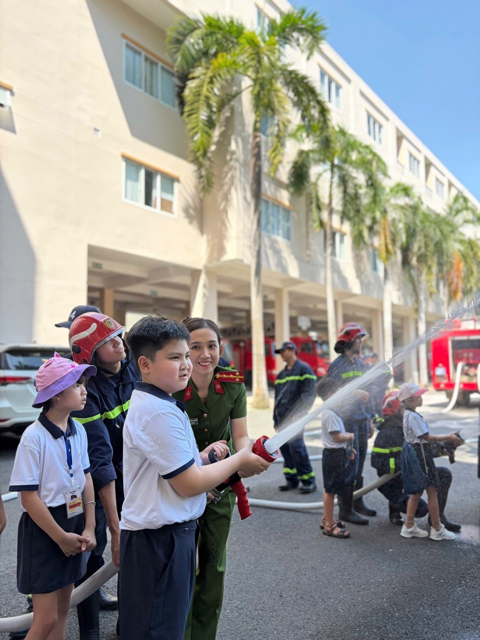 CBCS Phòng CS PCCC & CNCH hướng dẫn các em học sinh Trường mầm non Sao Khuê sử dụng lăng, vòi chữa cháy.